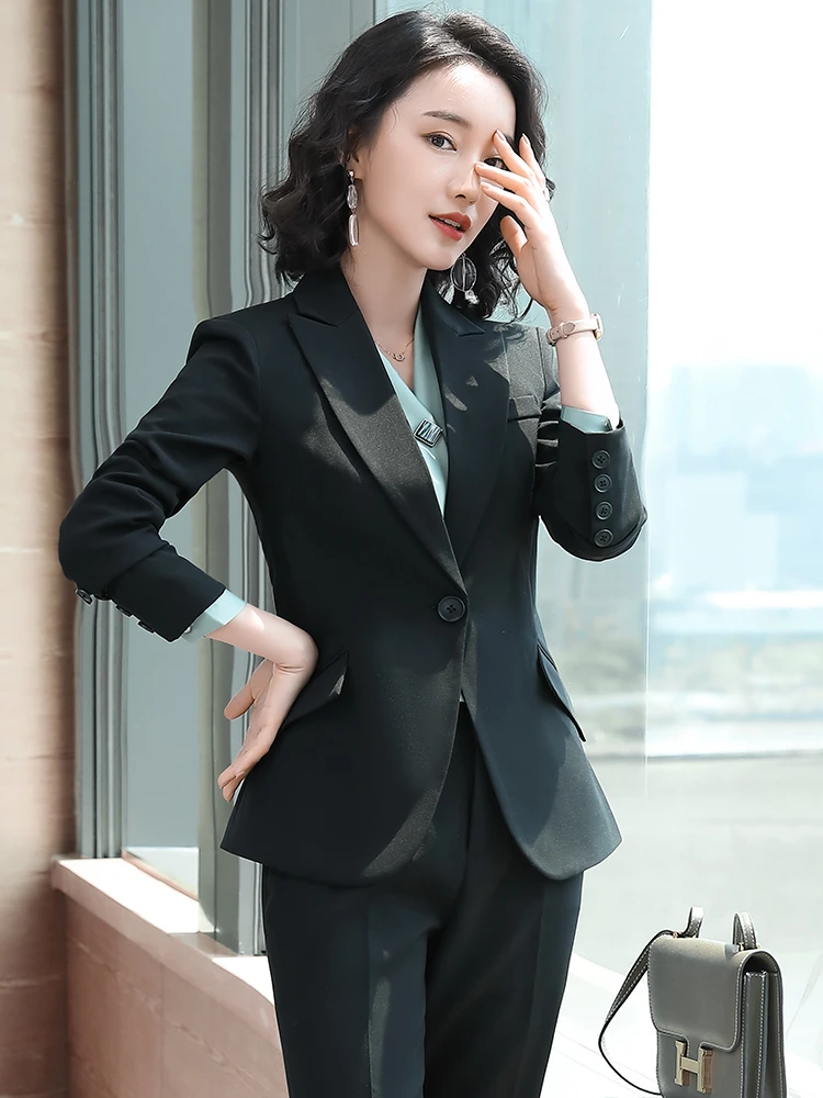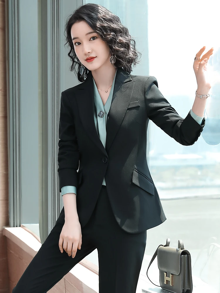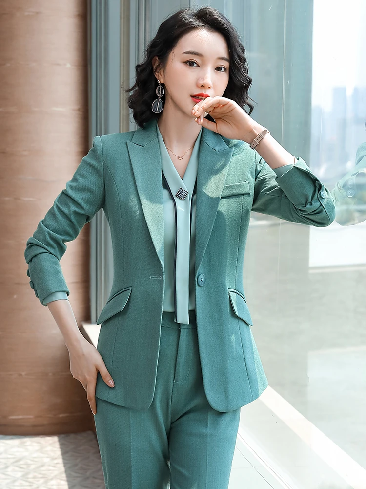 Женские деловые костюмы с длинным рукавом, элегантные Зеленые офисные костюмы с блейзером, осенне-зимние брючные костюмы