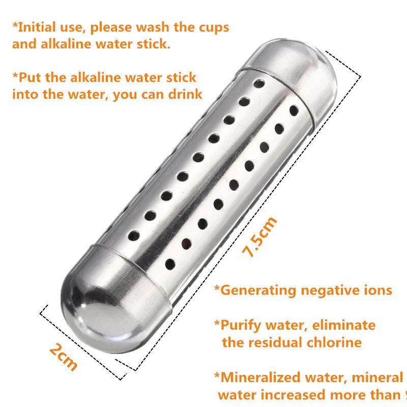 Особенности:-Внешний материал: нержавеющая сталь-Фильтр: Био Элементы внутри-Использование: Щелочная и ионизированная вода Как это работает?Щелочные водяные палочки содержат турмалиновый камень (Дальний инфракрасный), цеолит, камень Maifanshi, нефрит Muyu, глину, для нано порошок серебра, каолин редкой земли и многое другое. Эти материалы создают структуру воды, делая вашу воду чистой и вкусной.Турмалин выделяет дальние инфракрасные, отрицательные ионы, минералы и т. д., которые улучшают эластичность кожи и способствуют циркуляции крови и увеличивает обмен веществ. Преимущество:-Имеет меньшие молекулярные кластеры, которые способствуют более легкому поглощению.-Становится богатым антиоксидантами, ионизацией здоровых минералов и генерирует отрицательные ионы.-Способствует детоксикации алкоголя и табака.-Сбалансирует pH тела и добавляет микропитательные вещества.-Очищает воду и нейтрализует остаточный хлор и тяжелые металлы.-Щелочная вода увеличивает ваш показатель pH от 7,3-8,8.-Может иметь повышенное значение pH более 9. Посылка включает в себя:1X очиститель щелочной воды