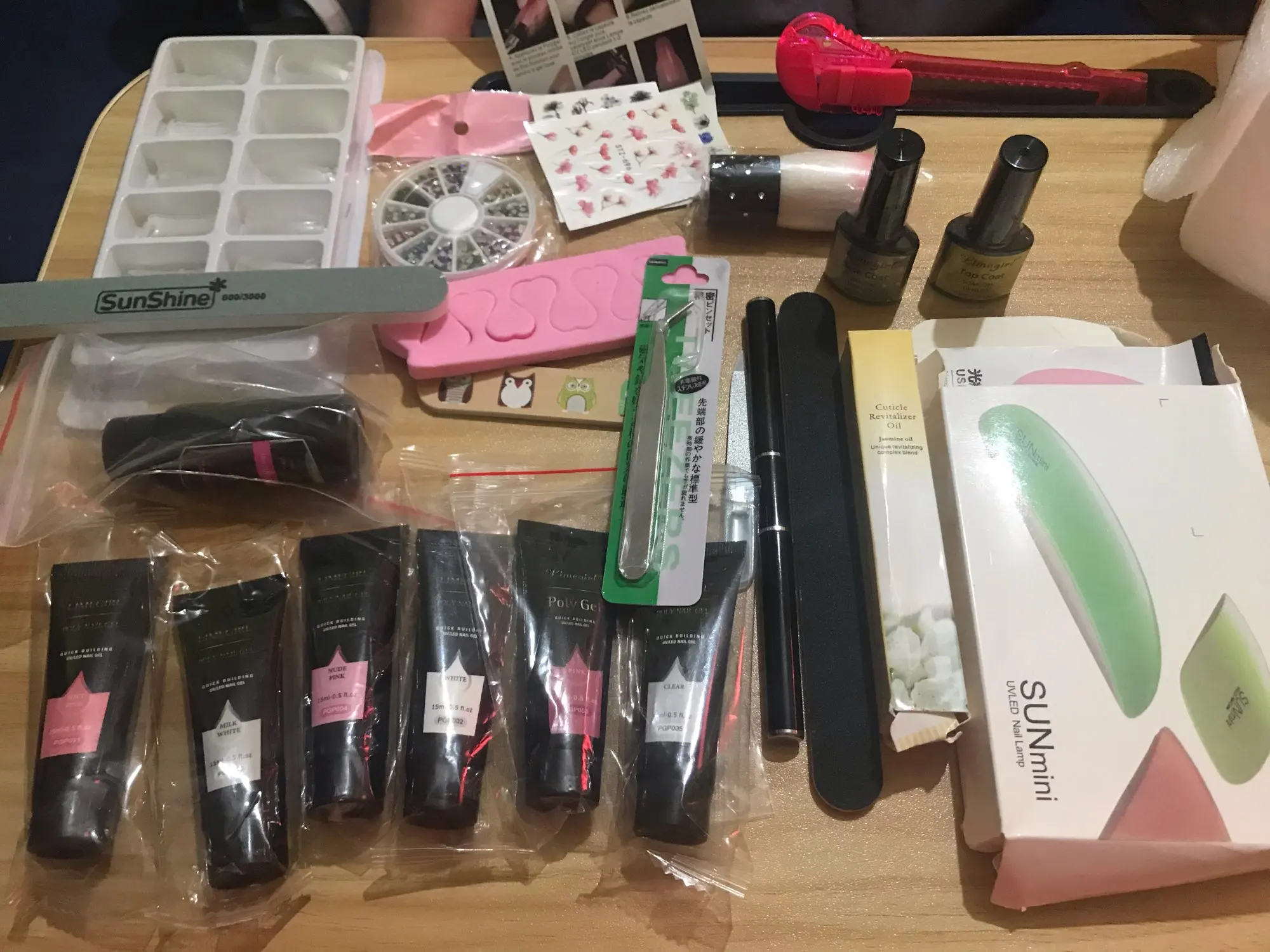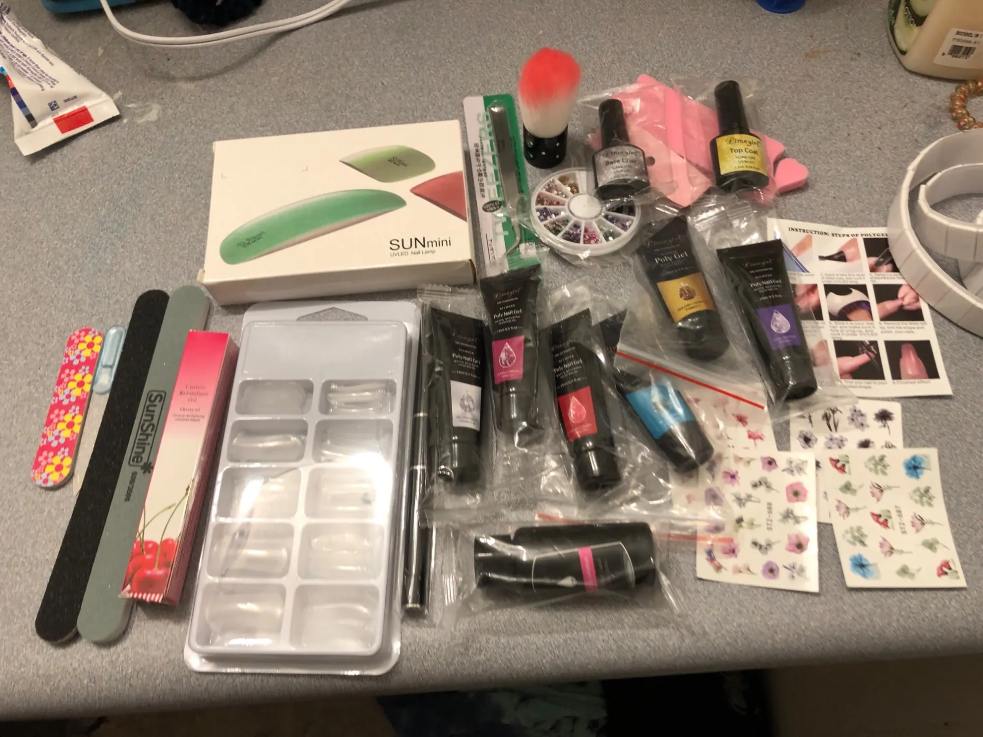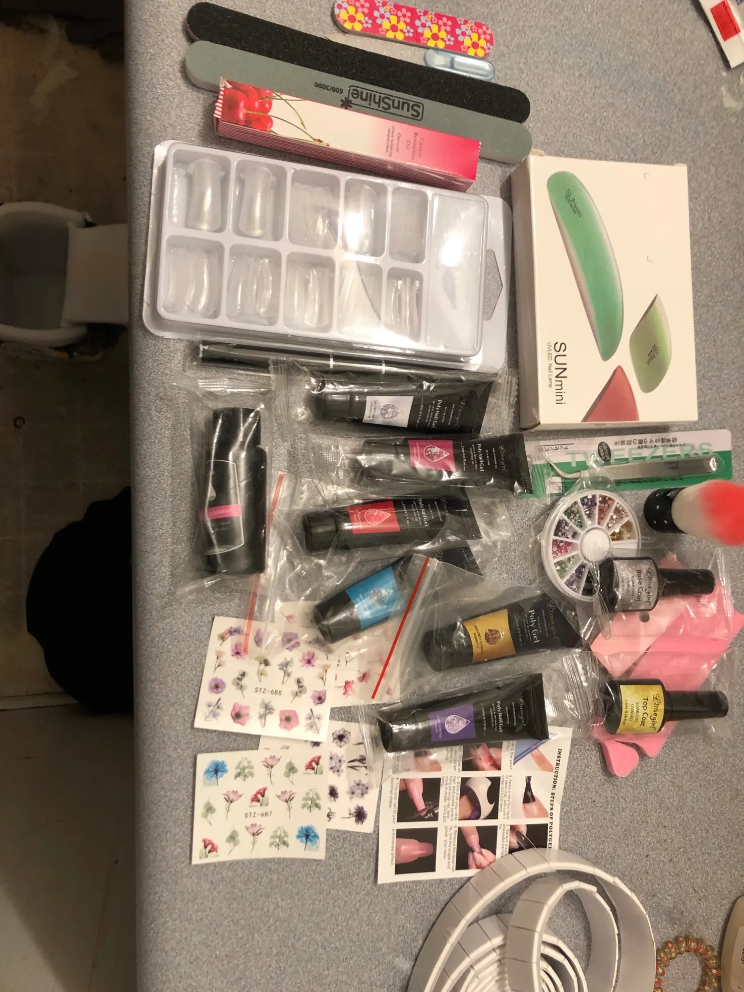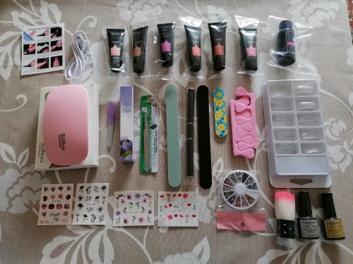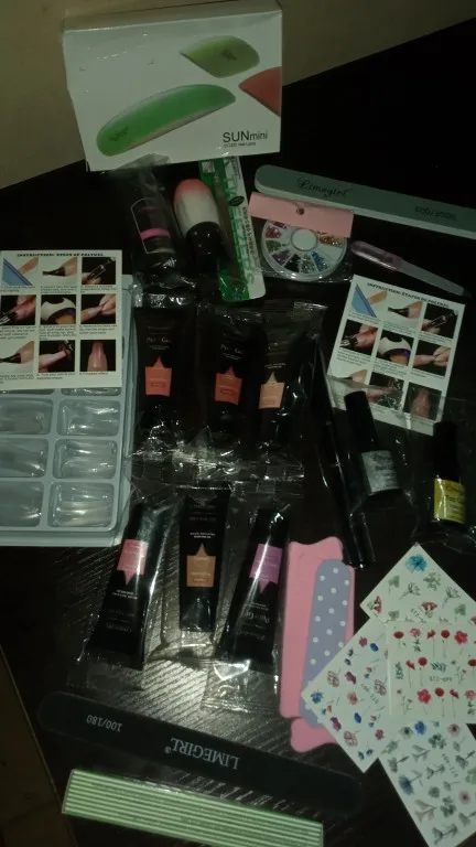 Хорошие вещи по цене. Вы получаете все это, включая свет для действительно хорошего предложения! Раньше я использовал полигель для наращивания и в первый раз это было легко сделать, но они поставляются с инструкциями, если вы этого не сделаете. Это действительно легко, просто не используйте слишком много геля на ноготь формы, и не нажимайте его слишком сильно. Мне нравится, что это все подошло! Раствор для скольжения, базовое пальто (чтобы помочь вещам приклеиться лучше) и верхнее пальто (для придания блеска) ногти имеют изогнутый вид, а не двойную форму, но они по-прежнему хороши, если вы знаете, как напечатать их правильно. 4 пилочки для ногтей, Масло для кутикулы, 6 полигелей, 4 упаковки стикеров, Отделители для ногтей, пинцеты, кисть для ногтей и круглые бусины для ногтей. Люблю этот комплект, я бы порекомендовал