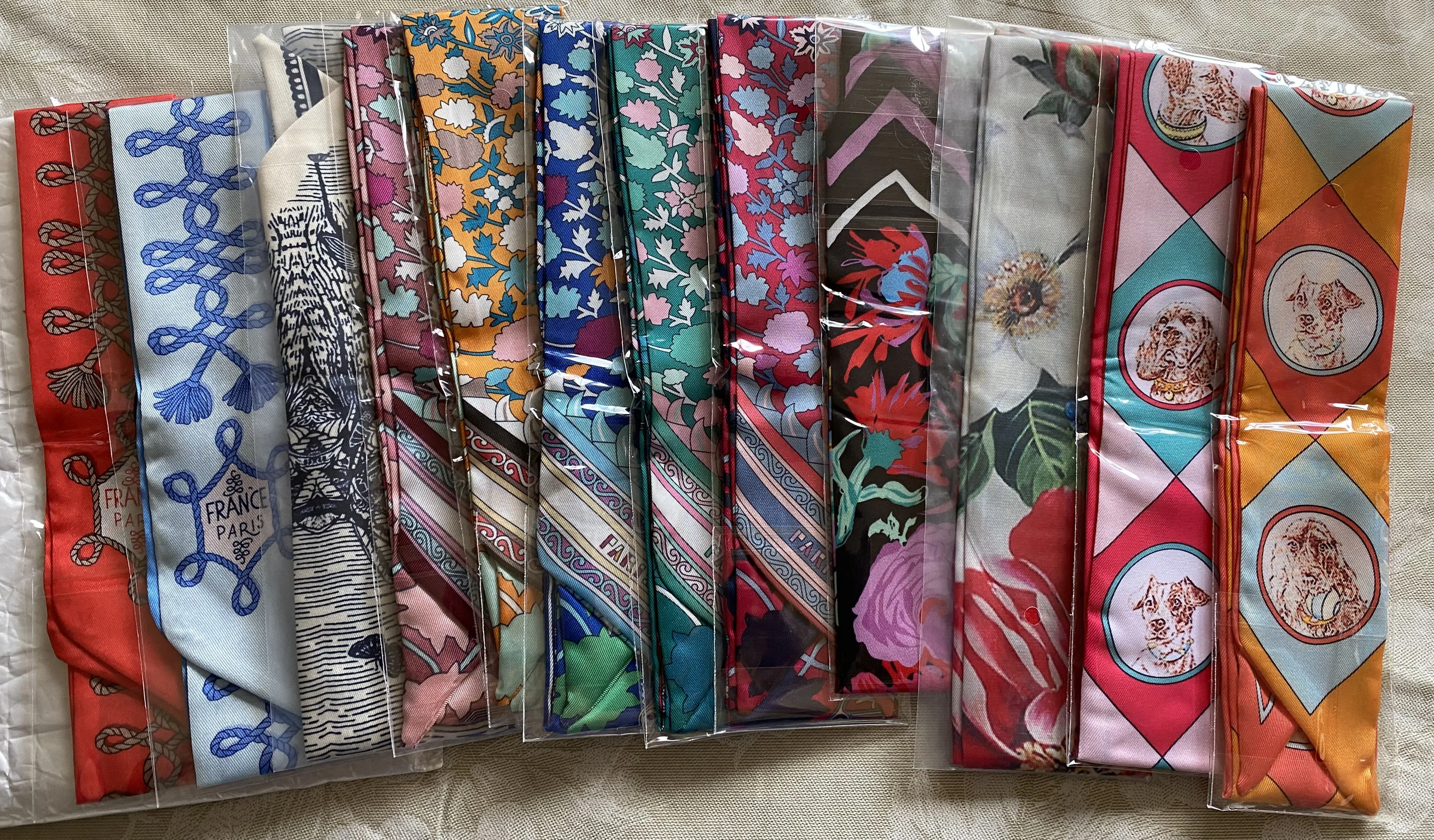 Отличные шарфы twilly. Я использую их на своих ручках вокруг шеи для украшения и в волосах. Продавец отличный, упаковал их очень хорошо и получил их своевременно. Я покупатель, возвращающий товар и буду покупать снова. Спасибо.