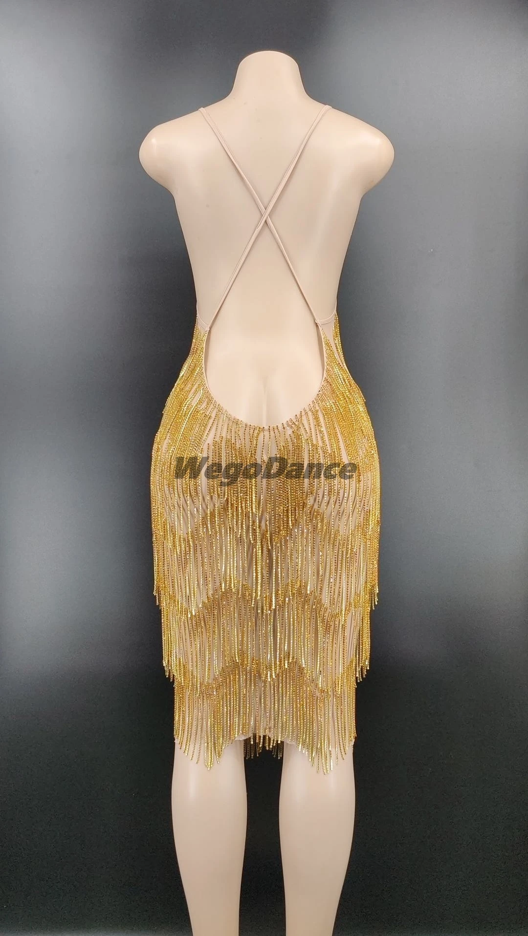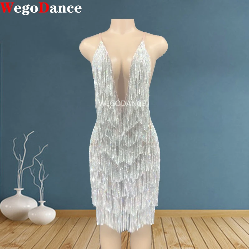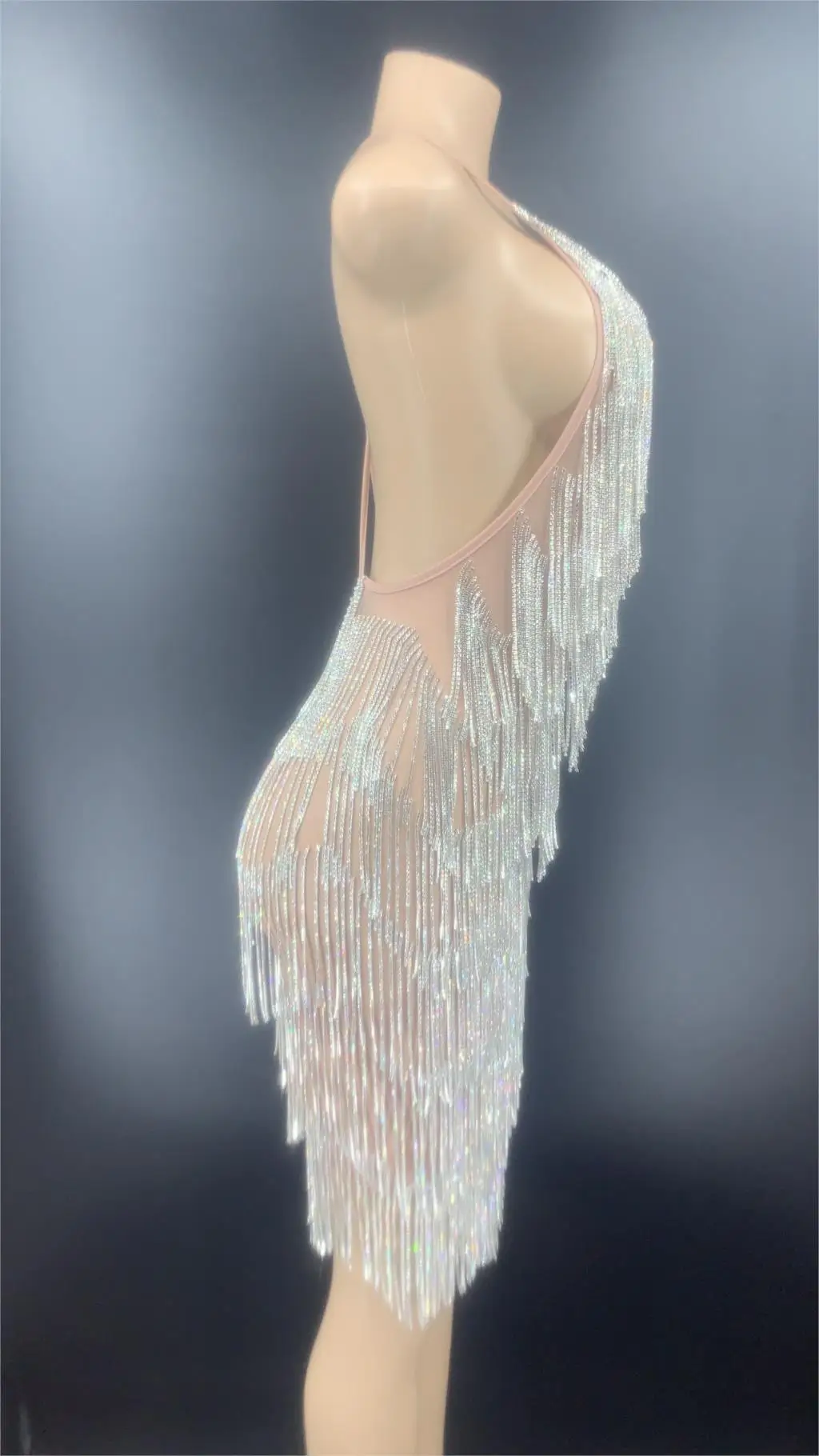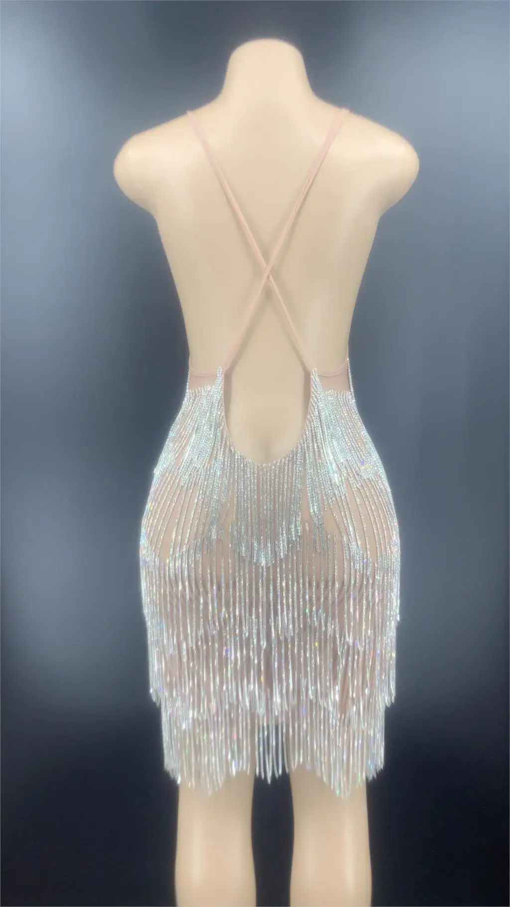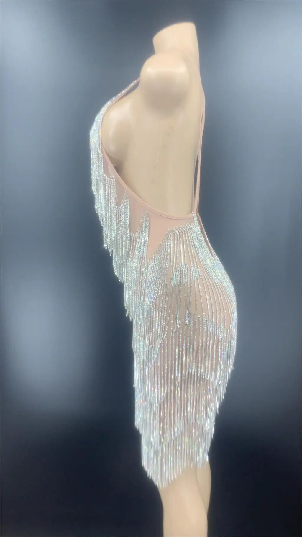 Новинка, женское блестящее серебристое прозрачное короткое платье стразы с бахромой, платье на день рождения с V-образным вырезом для танцев на выпускной