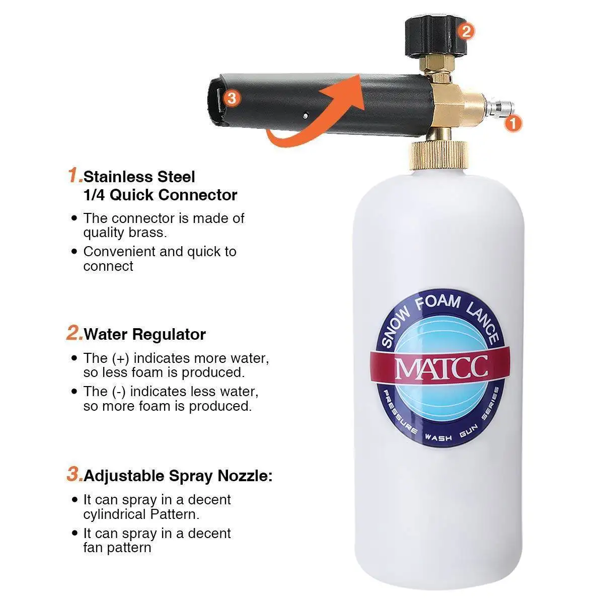 Примечание:С быстроразъемом 1/4 ", пожалуйста, проверьте свою машину перед покупкой, некоторые садовые шланги не подходят.Вымойте насадку пены чистой водой после использования. Избегайте блокировки фильтра от остатка мыла.Требуется мойка высокого давления имеет 2.0GPM и более 1000 PSI давление для использования.