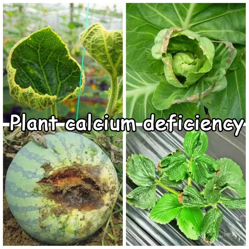 В отсутствие кальция, рост растений затруднен и межузлы короче, поэтому они обычно короче, чем обычные растущие растения и имеют более мягкие ткани. Меристемы, такие как терминальные почки, боковые почки и корневые кончики кальциевых растений, сначала появляются дефектные, скоропортящиеся и вымершие, молодые листья скручиваются и деформируются, И края листьев начинают желтеть и постепенно выгибать. Недостаток кальция приводит к незрелым apical бутонам и корневым концам, показывающим признаки «сломанной шеи», а молодые листья зеленые, деформированные и в форме крючка. В тяжелых случаях точки роста некротичны, а кончики листьев и точки роста-как пектин. При отсутствии кальция корни часто чернеют и гниют. Из-за недостатка кальция различные овощи гниют, молодые листья зерновых культур скручиваются и сохнут, а межлистовые и межлистные края функциональных листьев засыхают. Новые листья бобовых культур не растягиваются, а старые листья-белые пятна. Вены коричневые, а черешки мягкие и опускаются.
