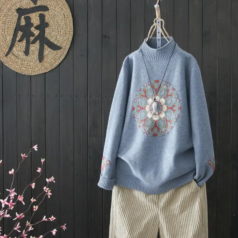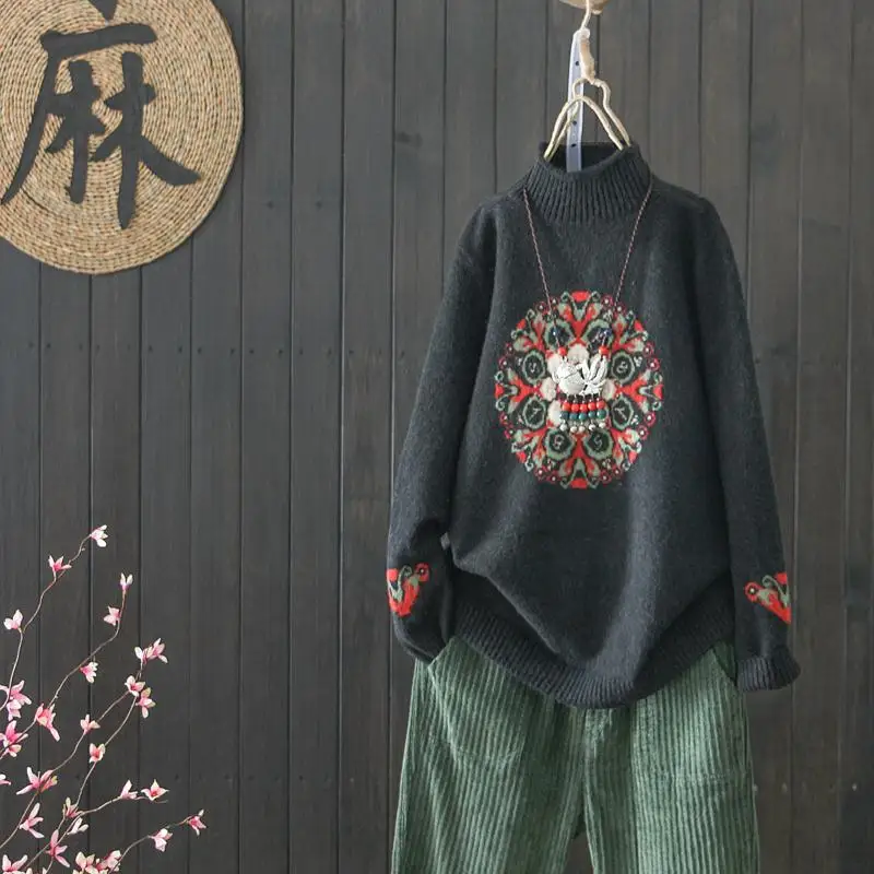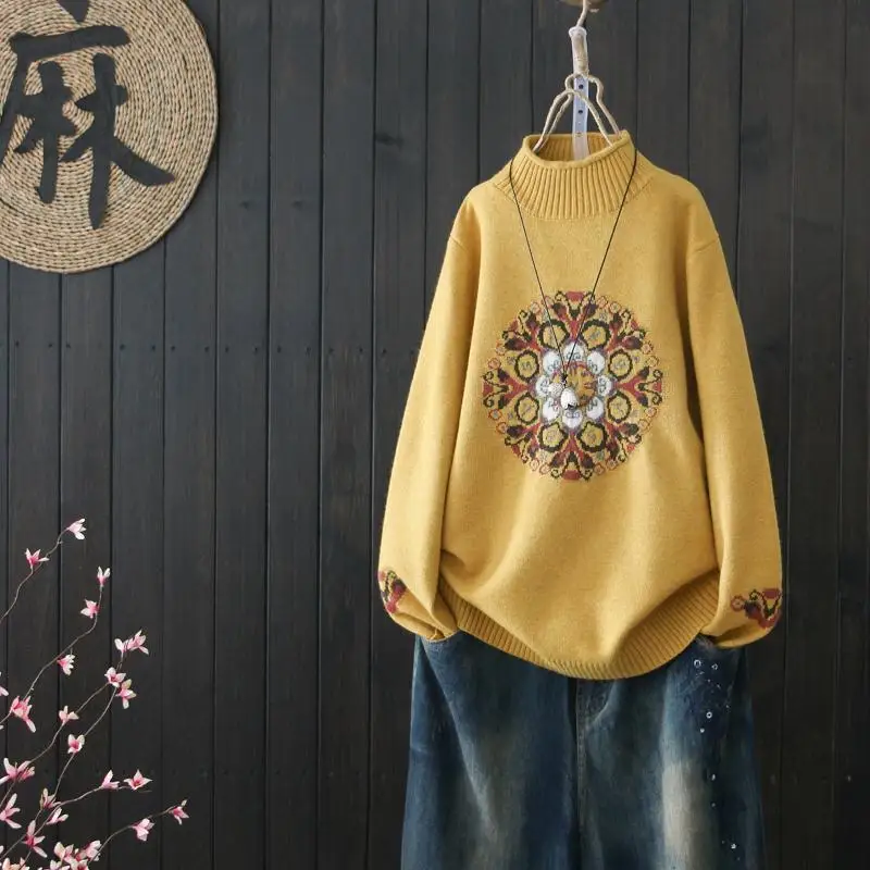 Женский пуловер в национальном ретро стиле, базовый свитер с высоким воротником на осень и зиму, размера плюс