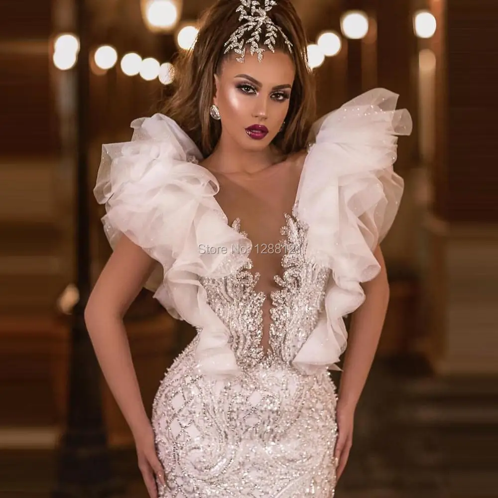 Длинное свадебное платье-русалка, с оборками, рукавами-крылышками и бисером, с аппликацией, 2021