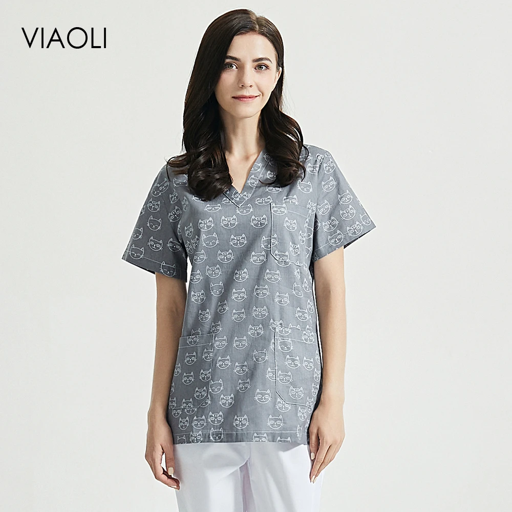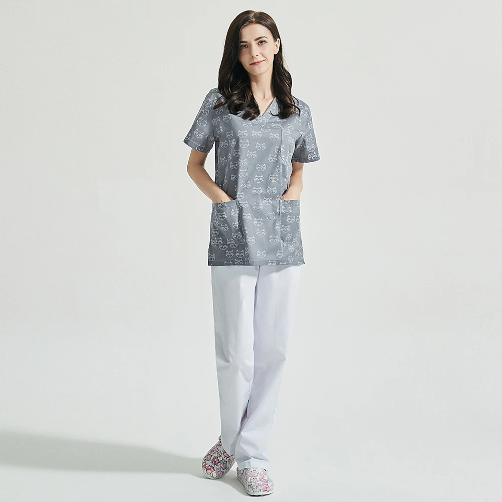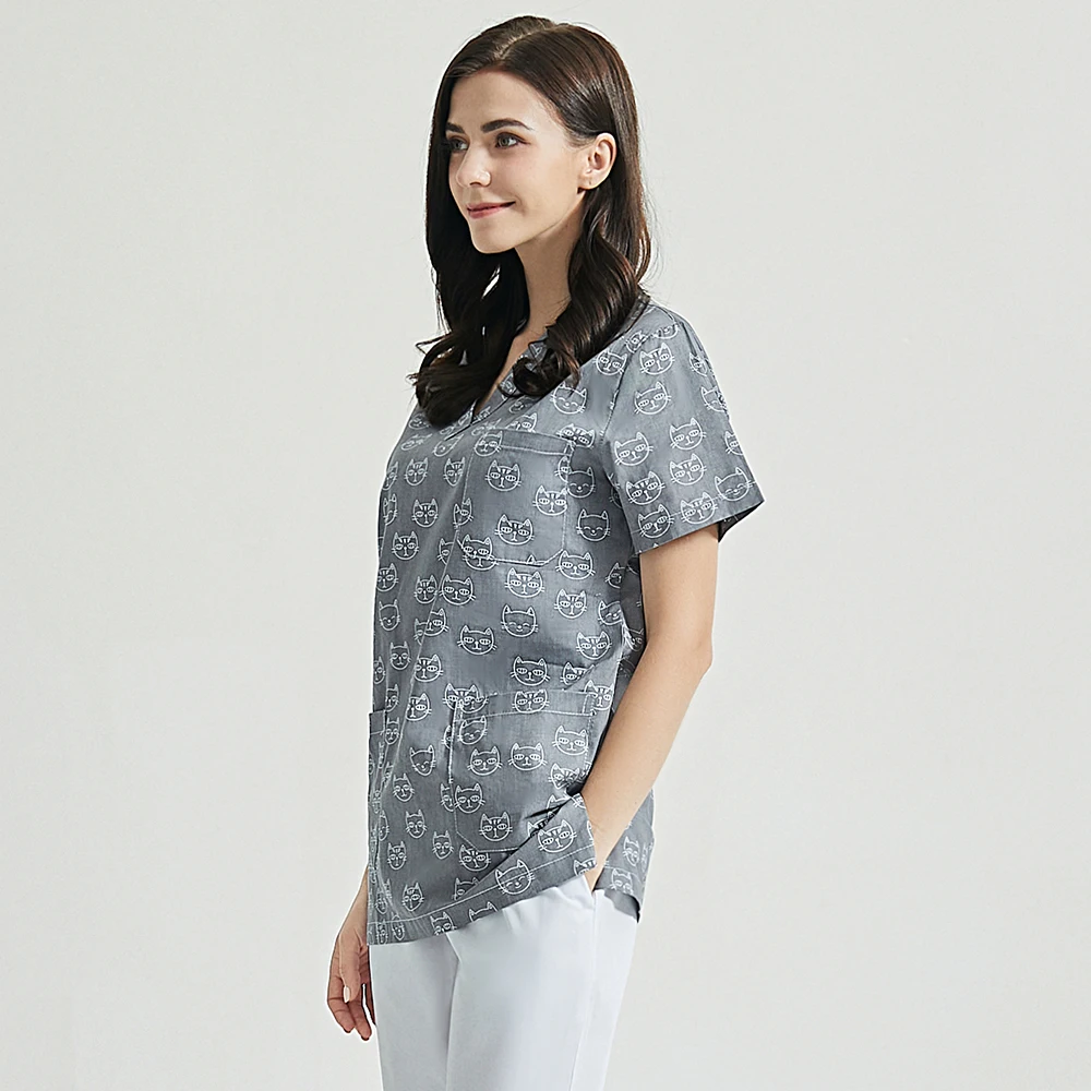 Топ для ухода за домашними животными с принтом кошки, Рабочая форма, топы и штаны, Пылезащитная рабочая одежда для лаборатории, дышащие хлопковые топы для мужчин и женщин на лето