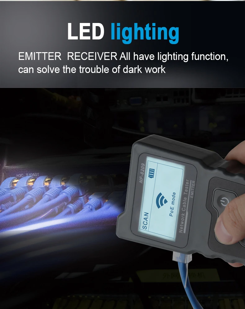 NF-8209-это новое поколение, предлагающее цифровую и аналоговую сигнализацию, все в одном сетевом тонере и зонде. Он оснащен тремя режимами для отслеживания кабеля, такими как цифровой режим, аналоговый режим и режим PoE. Это означает, что он оснащен самыми мощными технологиями расположения кабеля для любой рабочей среды. Кроме того, он включает измерение длины кабеля, тестирование неисправностей кабеля, тестирование PoE, функцию мигания концентратора и NCV, все это делает его необходимым инструментом для инженеров-кабельщиков.