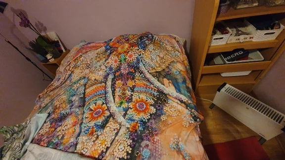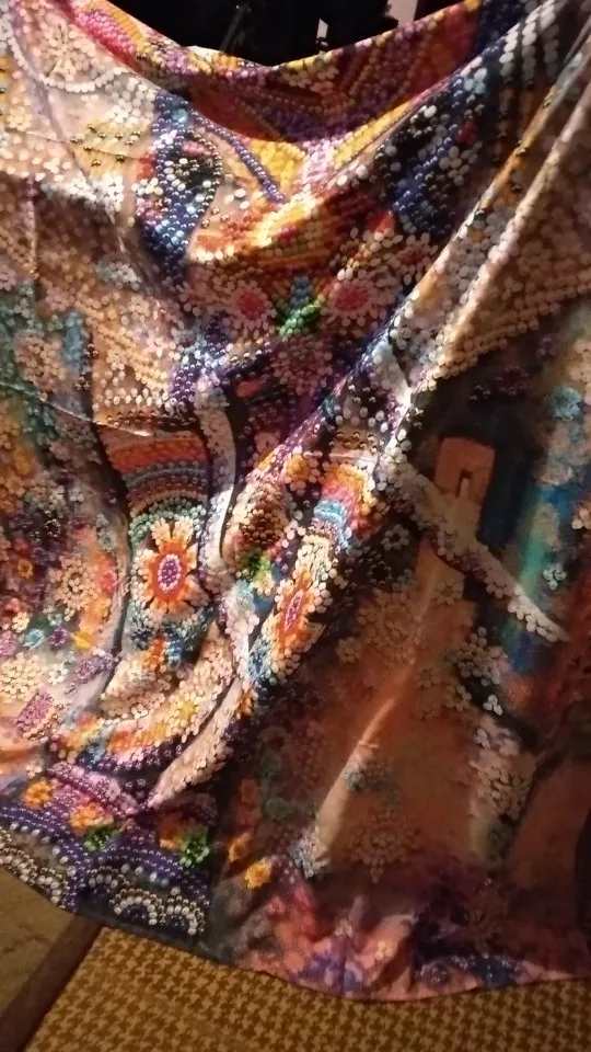 Хорошее качество, ткань тонкая правда. Но шёлковистая, и хорошо прочитать по бокам. в близится некоторые рисунки кажутся размерами, но когда разложишь то картина вырисовывается. в общем нормальный товар, можно пробовать для украшения дома. Дошёл за 2 недели в Норвегию.