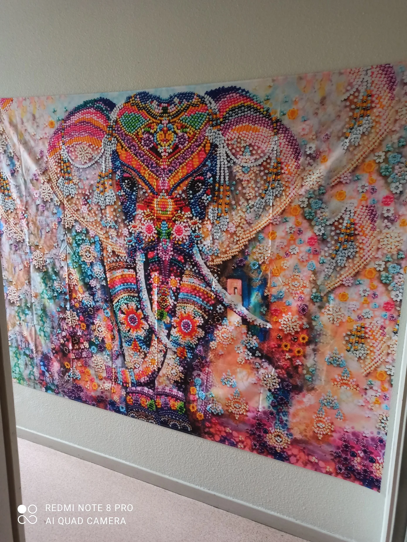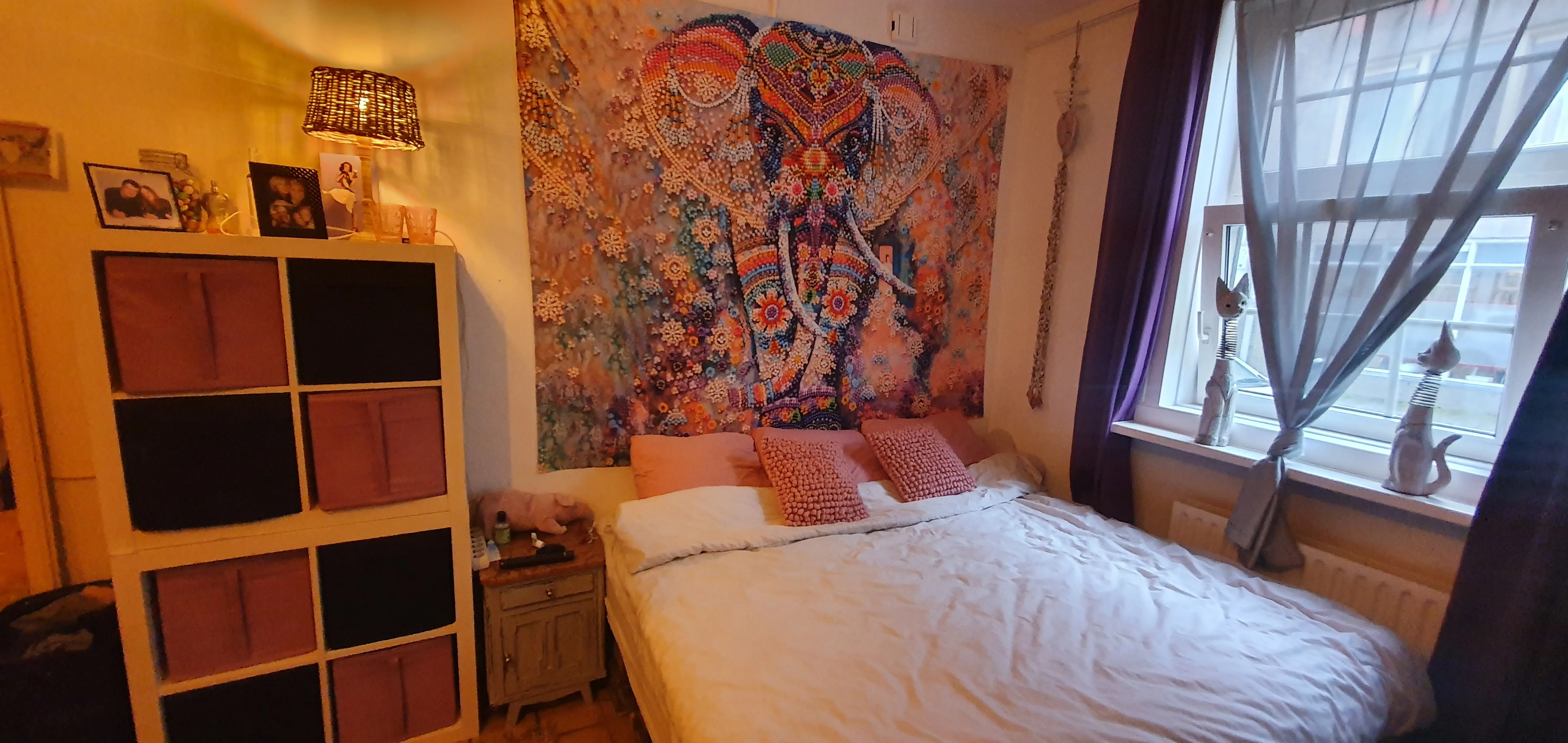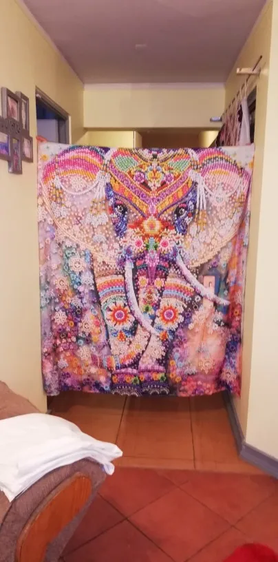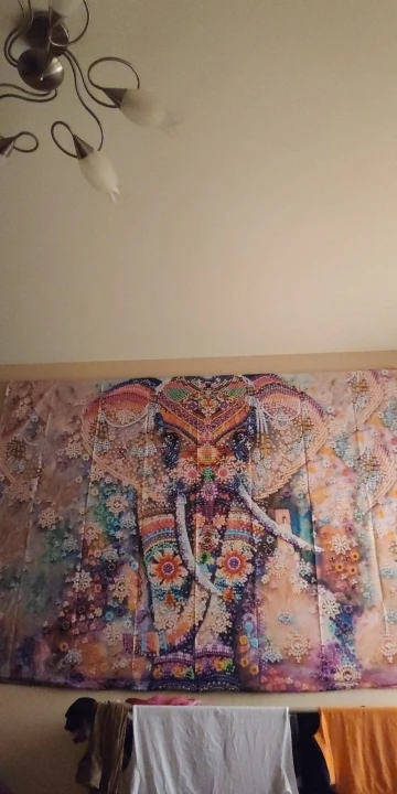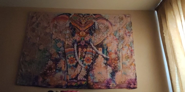 Доставка занимает семь недель. Сначала я был разочарован изображением. Крупным планом выглядит как впечатление низкого качества, но видя его издалека, эффект красивый! Выглядит так, будто снимает. Ткань легкая, поэтому висит просто