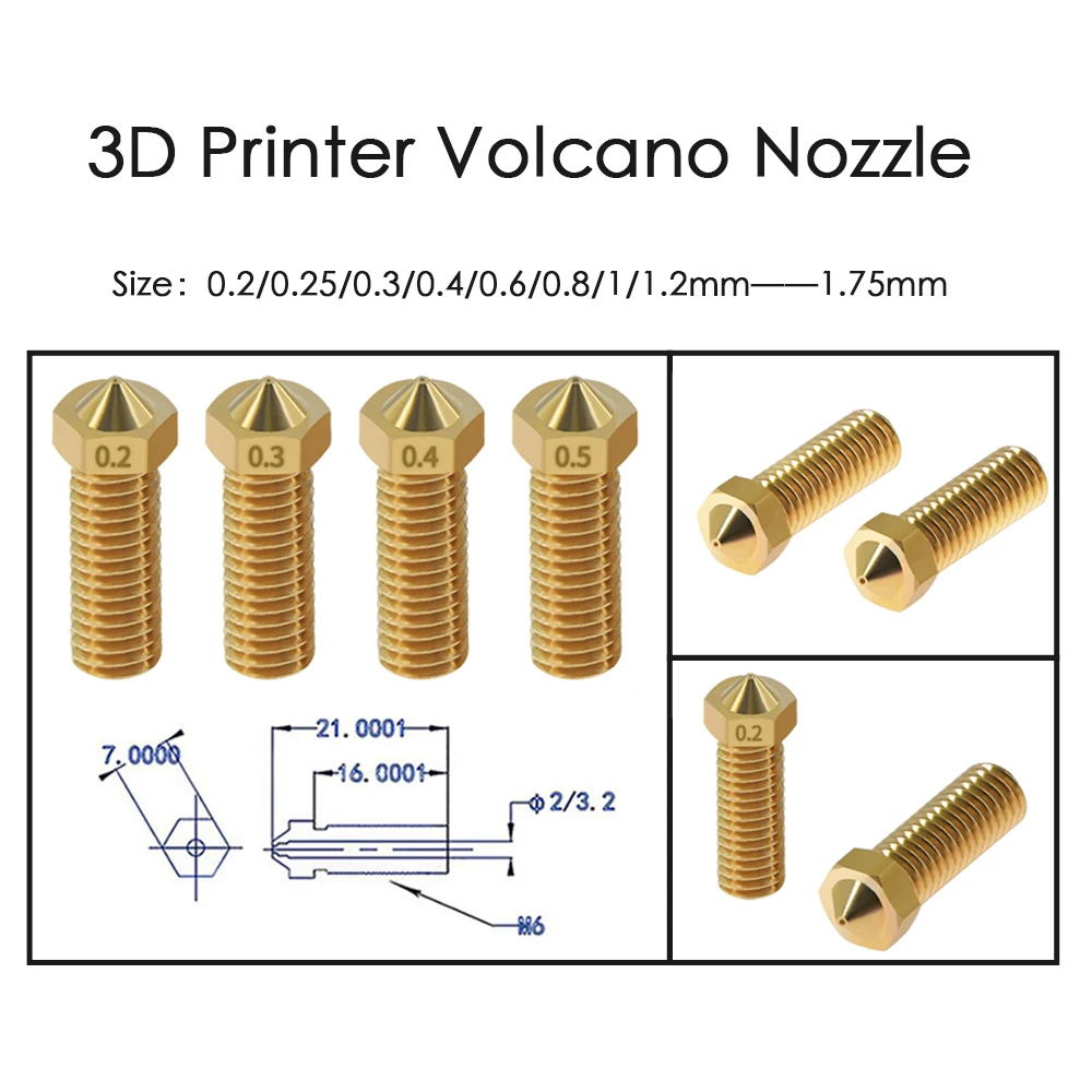 Сопло для 3D принтера Volcano 0,2-1 мм, 10 шт., для 1,75 мм, Большой Калибр с высоким потоком, искусственный кратер, горлышко вулкана