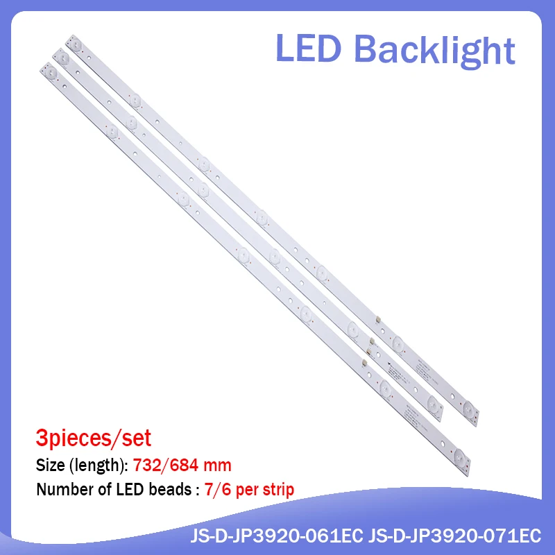 100% Новый оригинал! Длина полос фиксируется, не может быть вырезана. Тип лампы:JS-D-JP3920-061EC JS-D-JP3920-071EC Размер: 732/684 мм Светодиодный Кол-во: 7/6 светодиодный s Напряжение: 0-94 в Напряжение бисера: 6 ВПосылка включает в себя:3 шт./компл.