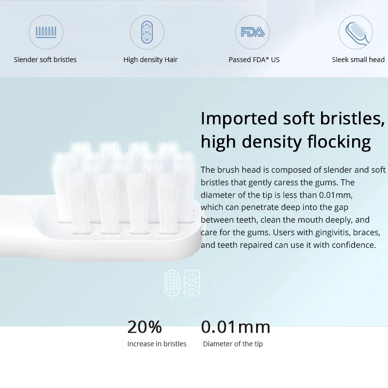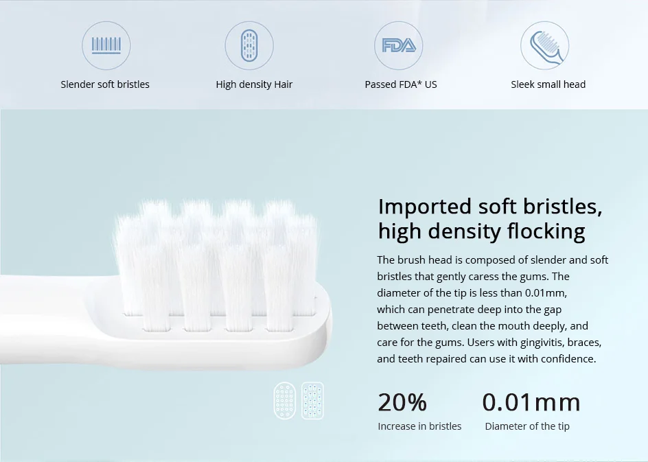 Головка кисти состоит из тонких и мягких щетин, которые мягко ласкают десны. Диаметр наконечника составляет менее 0,01 мм, который может проникают глубоко в зазор между зубами, глубоко очистить рот, а также забота о десен. Используйте rs с гингивитами, брекетами и зубцами, отремонтированными, можно использовать с уверенностью