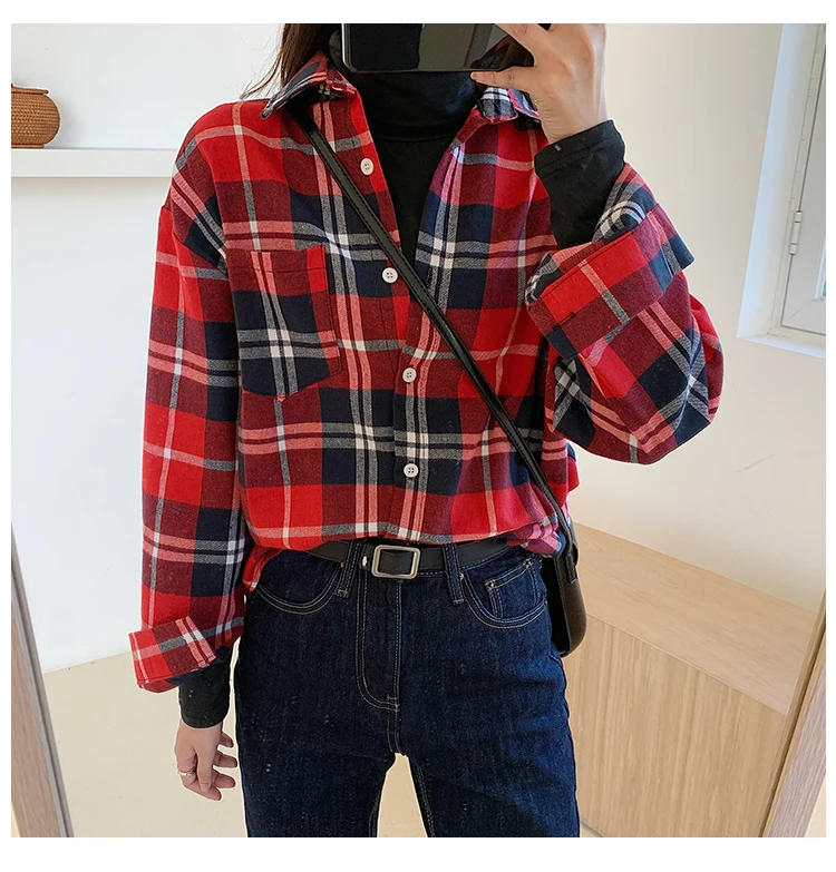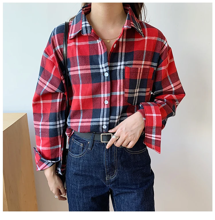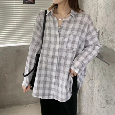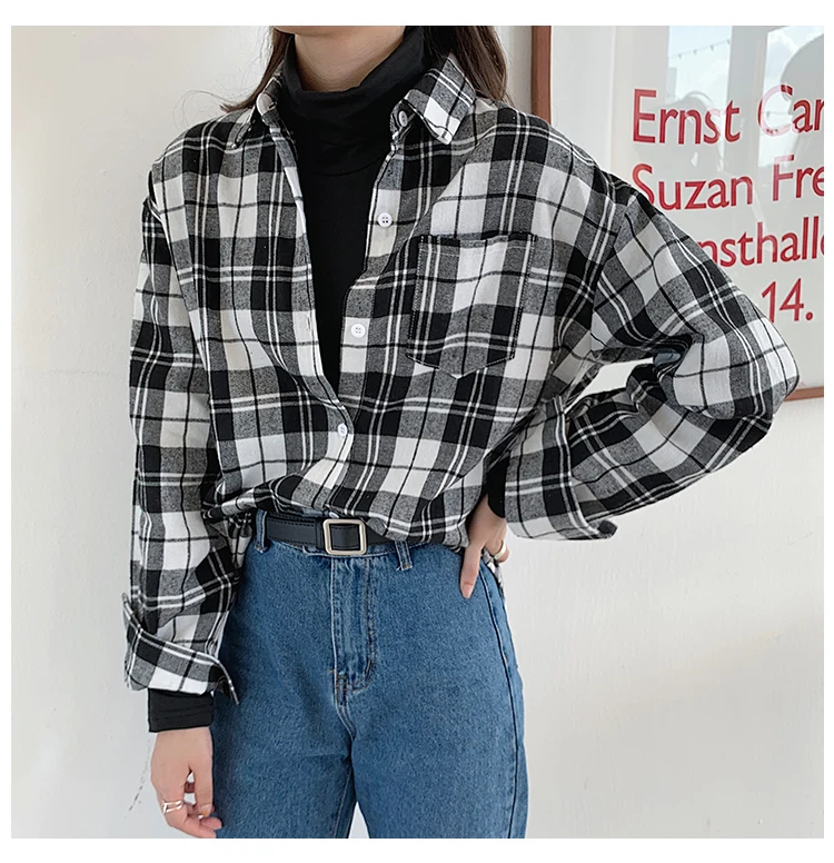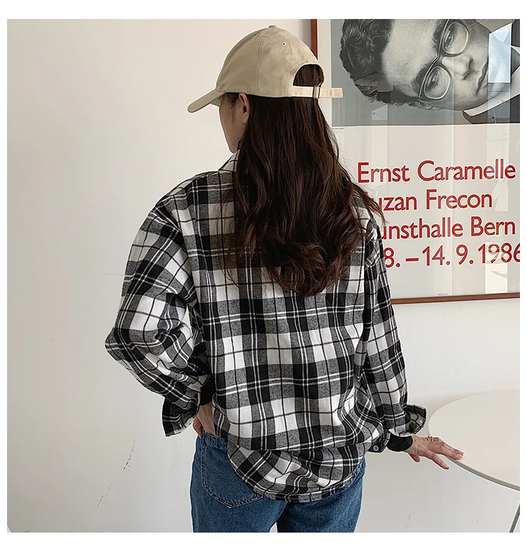 Женская рубашка с длинным рукавом, винтажная Классическая Свободная рубашка в клетку с отложным воротником