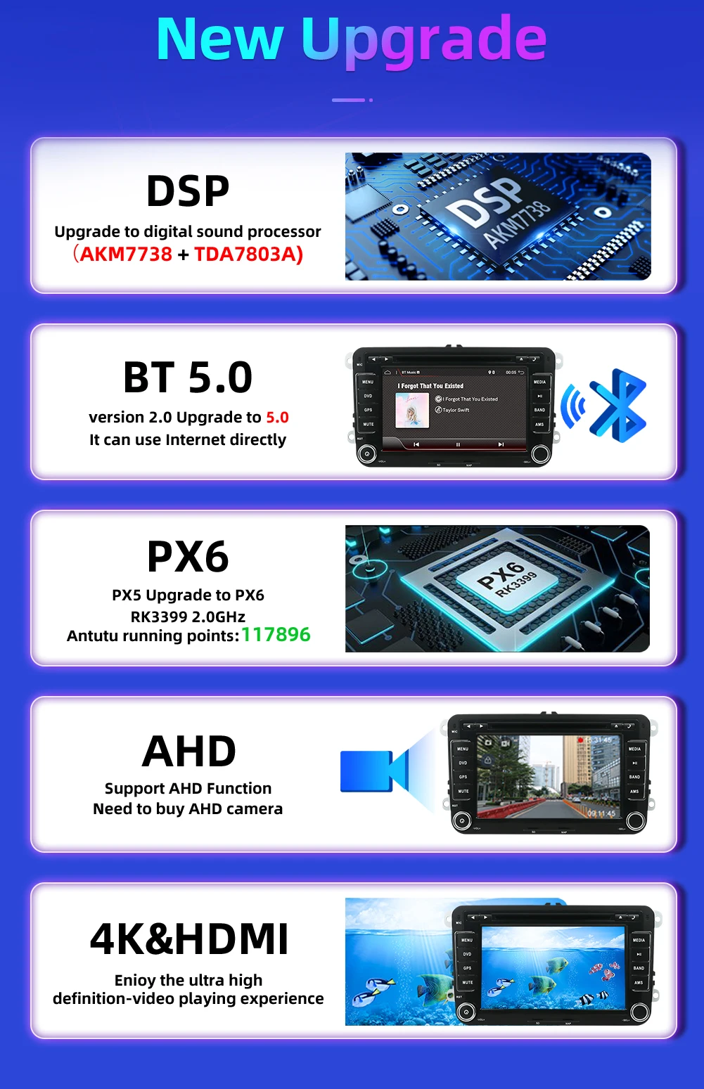 7-дюймовый Android 10,0 + емкостный экран + 1024*600 + Восьмиядерный процессор RK3399 2,0 ГГц + DDR3 4 Гб флэш-памяти + 64 Гб памятиPX6 Cortex A72 + A53Выходная мощность: 4*45 ВтРабочая температура-20 ℃-+ 70 ℃Видео: поддержка 1080P,AUX IN, RCA выход
