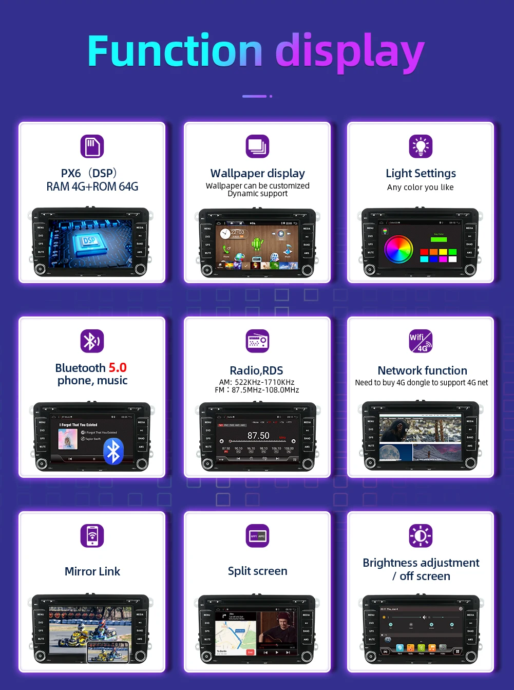 Сенсорный экран + радио + FM/AM + RDS + GPS-навигация + карта + Wifi + Bluetooth + управление рулевым колесом + Разделенный экран + USB + SD + AUX вход/выход + зеркальная ссылка + задний камера просмотра + сабвуфер + воспроизведение + эквалайзер + набор обоев + логотип автомобиля + 3G/4G + TPMS + DAB + OBD 2 + DVR + TV