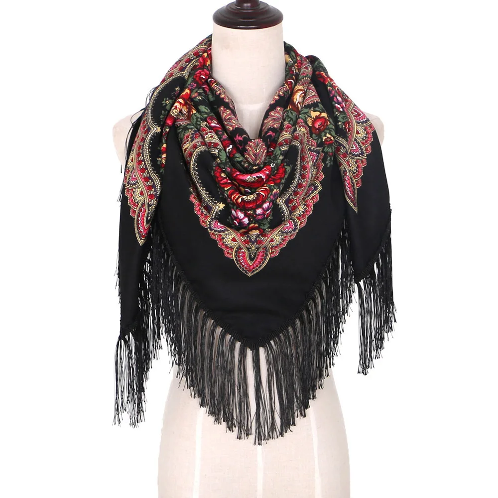 Хлопковый шарф с бахромой в этническом стиле, мусульманский хиджаб на голову, осенне-зимняя шаль в ретро-русском стиле с принтом, женский платок