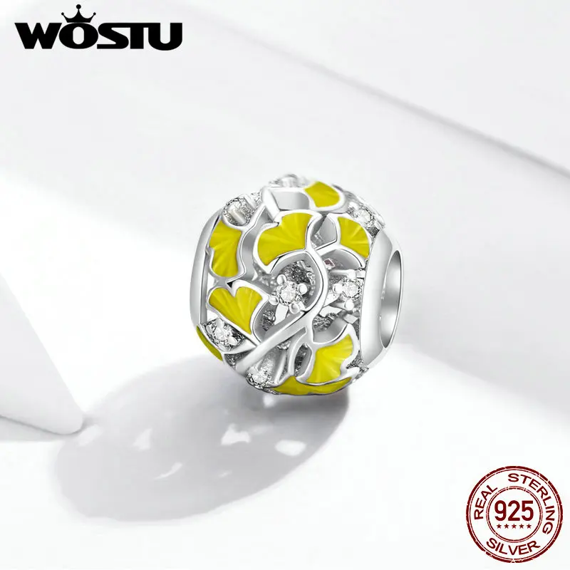 WOSTU гинкго подвески в виде листьев стерлингового серебра 925 пробы желтая эмаль желтый CZ Круглый бисер Подходит оригинальный браслет ожерелье драгоценность; ry CTC334