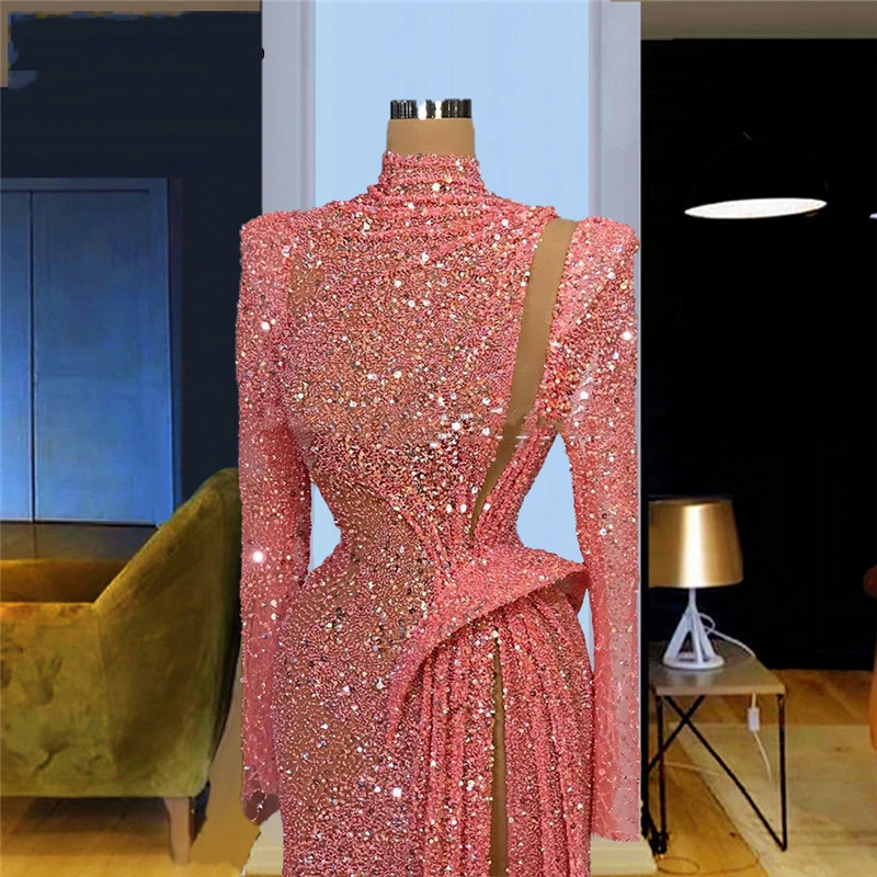 Женское вечернее платье с длинным рукавом, элегантное платье русалки с розовыми бусинами и высоким воротником, вечернее платье в турецком стиле