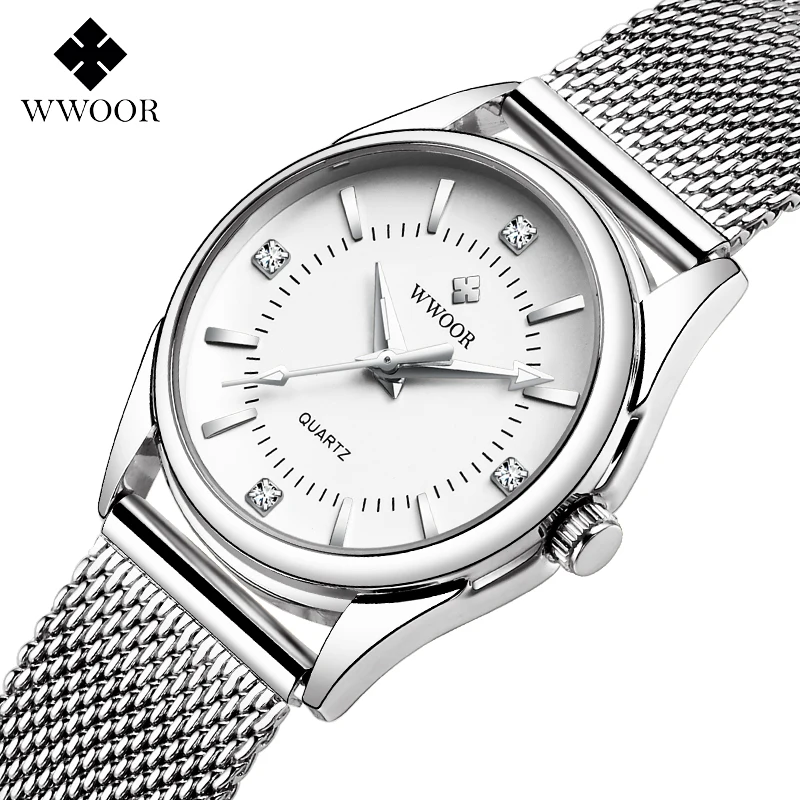 Женские наручные часы WWOOR, Серебристые часы с браслетом из нержавеющей стали, с бриллиантами