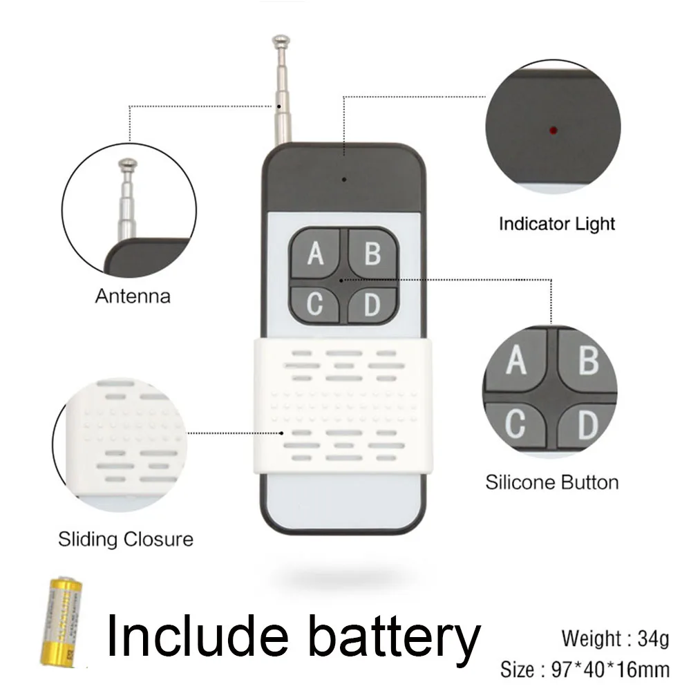 Особенности: 1: супер дистанционный пульт дистанционного управления, вы можете контролировать место, которое вы хотите контролировать в первоначальном месте 2: Широко применяется: высокомощный приемник 30A. Может использоваться во многих местах. -- Область применения продукта продукты могут быть использованы в домах, фермах, фабриках, офисах, лабораториях, супермаркетах и так далее -- Электрический занавес с дистанционным управлением \ водяной насос \ вентилятор \ лампа \ светодиодный светильник \ лампа \ вентиляционное устройство \ передача сигнала -Увлажнители с дистанционным управлением, микроволновые печи, кофемашины 3. Имеет сальто, избегайте случайного касания