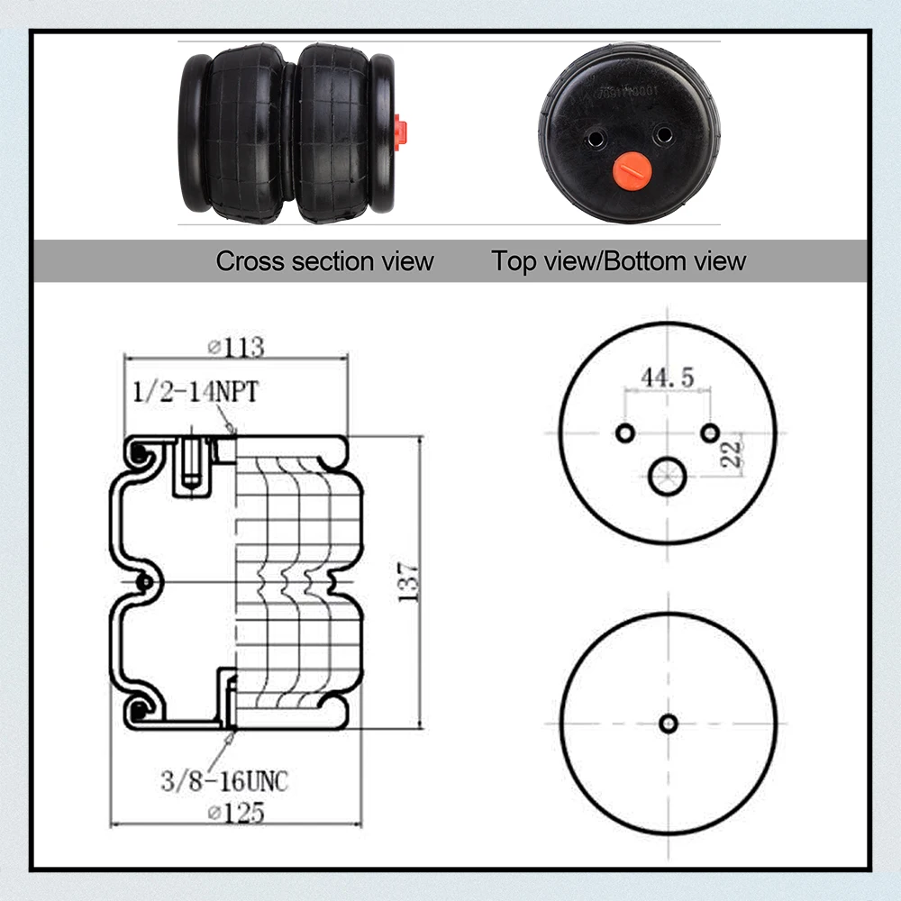 Спецификация:100% гарантия качества протестирована, более отзывчива, дешевле, проще в установке.Эта воздушная сумка даст вам представление, которое вы жаждете. С большим подъемом, более мягкой, гладкой ездой и самой низкой ценой в отрасли!Тип: один 1/2 "порт.Застежка сверху: 3/8 ″ - 16.Высота конструкции: 137 мм.Крышка загрузки. На 3,0 бар: 3,85 кн.Крышка загрузки. На 7.0bar :9.52kn.Пожалуйста, убедитесь, что воздушная езда подходит вашему автомобилю. Очень важно сравнить размер отверстия и расстояние между отверстиями для пневматической пружины.