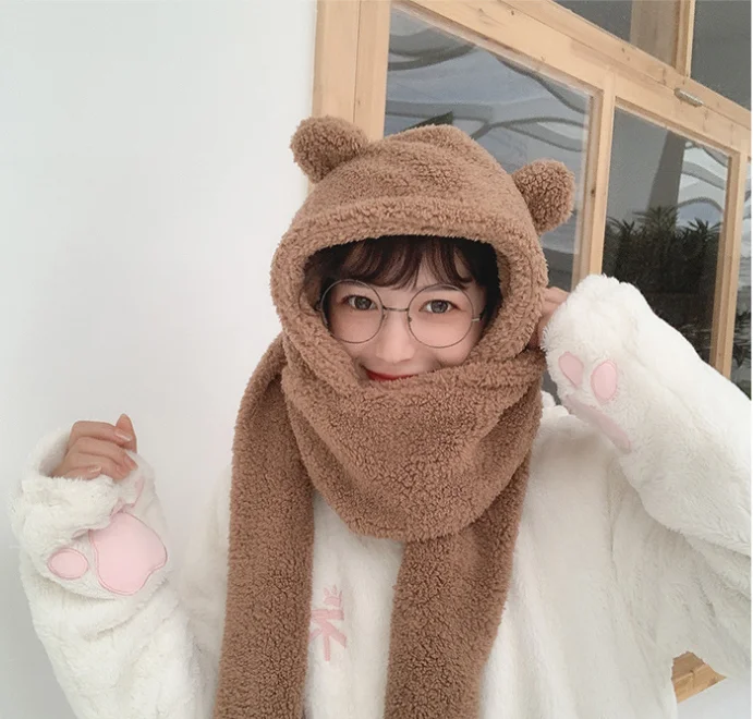 Модные зимние женские облегающие шапки 2022 Новинка теплые шапки с милыми медвежьими ушками Повседневная плюшевая шапка шарф Набор повседневные однотонные женские шапки подарок