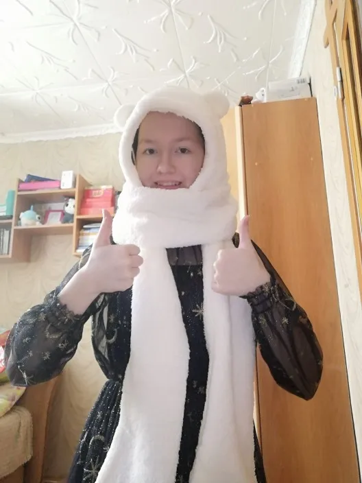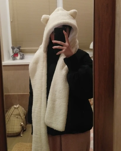 я в восторге!!! один край длиннее другого, чтобы обмотать вокруг шеи, очень удобно; просто супер мягкая, милая, довольно теплая, сочетается со всеми вещами (*≧ω≦*) ; пришла за 21 день, но продавец оформлял заказ неделю ;с ; большое спасибо за такую крутецкую шапку!!!