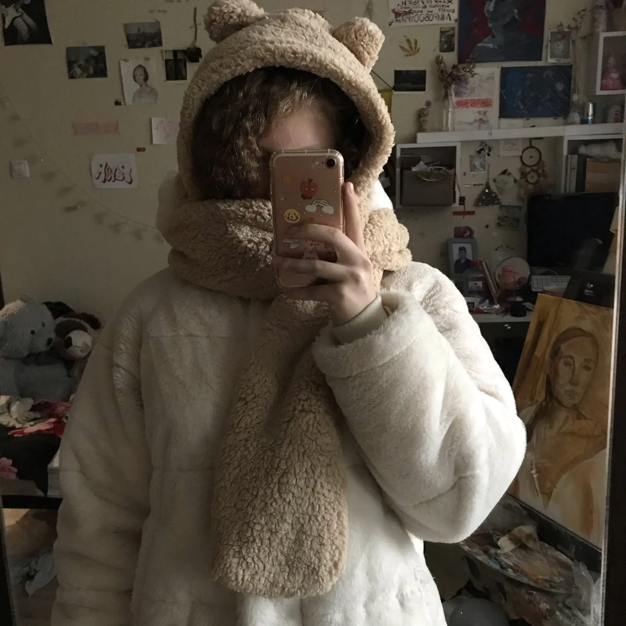 очень крутая шапка. боялась, что будет так себе, но она офигенная! выглядит прямо как на фото. доставили за месяц. очень мягкая и приятная. один конец шарфа короткий, другой длинее. можно прям закутаться в неё. правда немного пахнет, но это не так отвратно и терпимо. в общем, всем рекомендую, не пожалеете