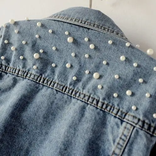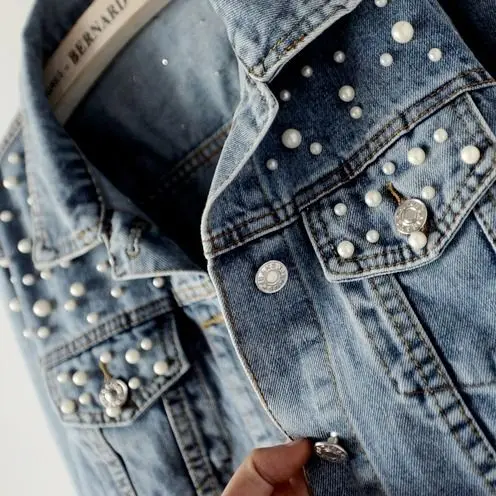 Куртка женская джинсовая с жемчугом, повседневная верхняя одежда из денима, пальто с длинным рукавом, осень 2020