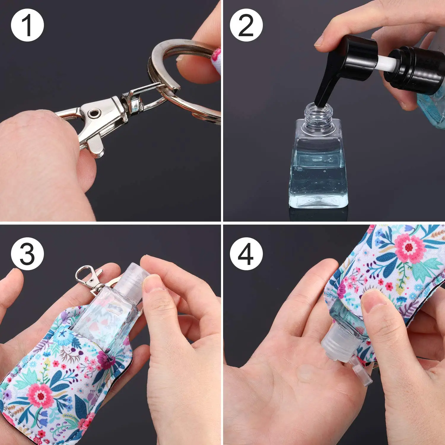 Залейте нужную жидкость в портативную бутылку и вставьте бутылки в держатель для ключей, прикрепляется непосредственно или с помощью зажима для ключей к рюкзаку, коляске, сумке для спортзала и многому другому, подходит для ежедневного использования и путешествий