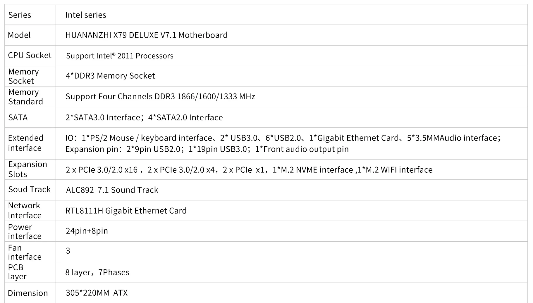 Модель: HUANANZHIТип товара: X79 DELUXE V7.1 материнская платаТип материнской платы: ATXОсновной чип: серия X79Слот для видеокарты: 2 * PCI-E 3,0 16X 1 * PCI-E 1X 2 * PCI-E 4XВстроенная Видеокарта: нетПитание: 7 фазы ПитаниеСлои печатной платы: 8Ethernet: гигабитТип процессора: LGA2011 E5 1650Слот памяти: 4 * DDR3(4 канала)Максимальный объем памяти: 32Gx4 DDR3Скорость памяти: 1866/1600/1333Поддерживаемый Тип памяти: без ecc/reg ecc/eccИнтерфейс SATA: SATA3.0x2 SATA2.0x4Интерфейс USB: USB3.0x6 USB2.0x10 (включая расширение)Интерфейс M.2: M.2 NVME.M.2 Wi-FiАудио порт: ALC892 7,1 каналРазмер: 305x220ммКоличество: 1 шт.