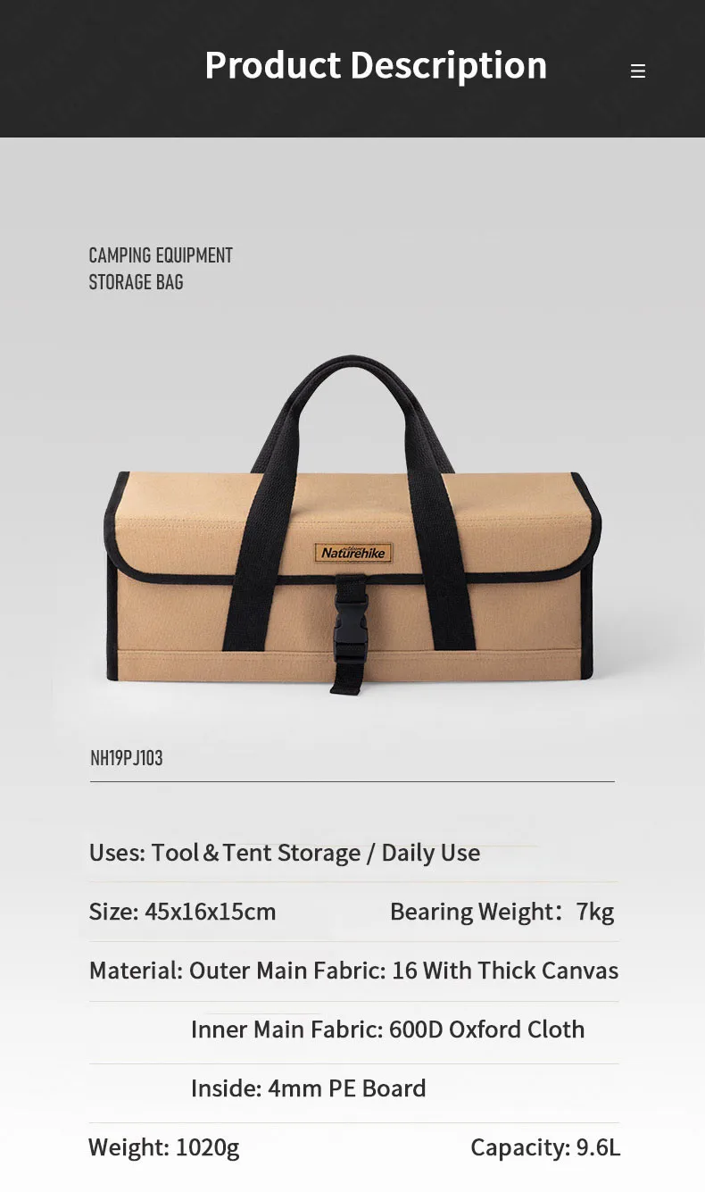 Бренд: NaturehikeНаименование: сумка для хранения оборудования для кемпингаВес: 1020 г, 668 гРазмер: 45x16x15 см; 34x14.5x14смРазмер упаковки: 45*16*8 смВес подшипника: 7 кгЕмкость: 9,6 л, 5,7 лМатериал: внешняя основная ткань: 16 с толстым полотномВнутренняя основная ткань: 600D ткань ОксфордВнутри: 4 мм PE доскаИспользование s: инструмент/посуда/Палатка/пикник/ежедневное использование