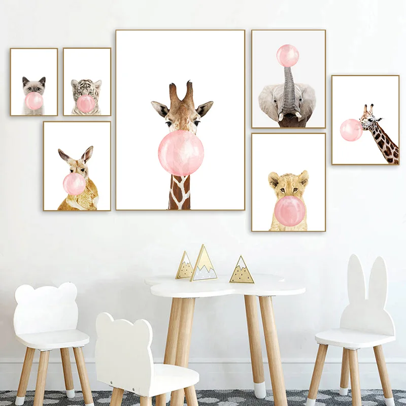 Розовый пузырь слон постер с жирафом принт животных Детская стена искусство холст картина детская картина скандинавский декор для детской комнаты