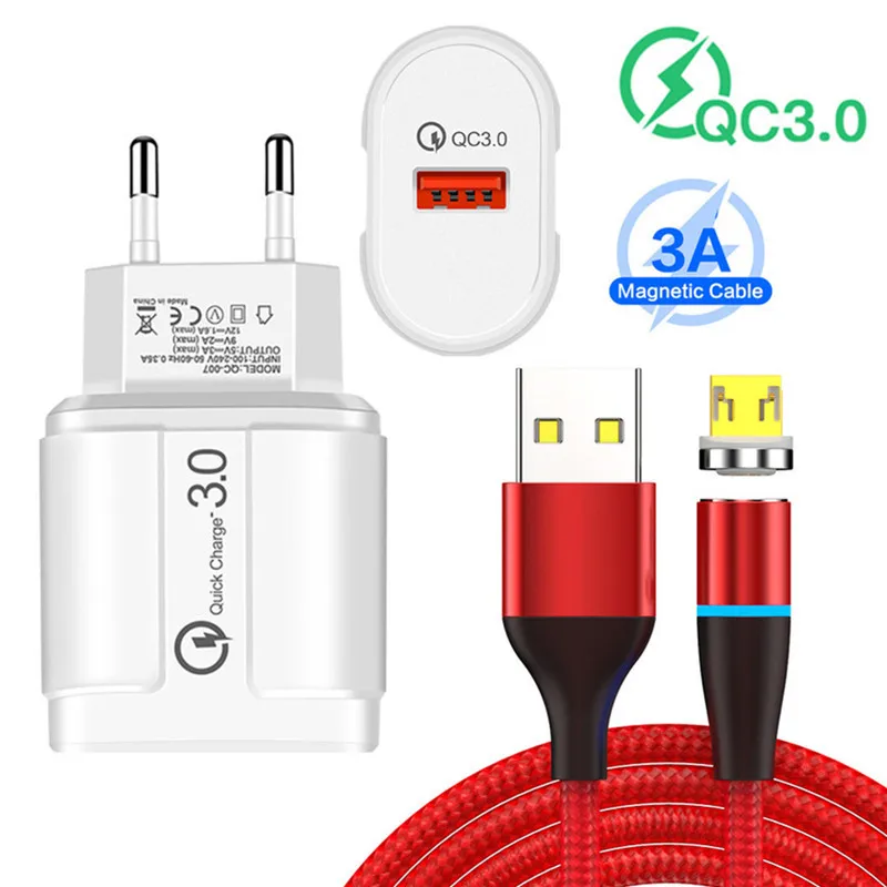 Сетевое зарядное устройство QC 3,0 для OPPO A9 A5 2020 Type C 3A, магнитный кабель Micro USB для Samsung A10 M51 Honor 9x9s 8a Xiaomi 9 Redmi 9a
