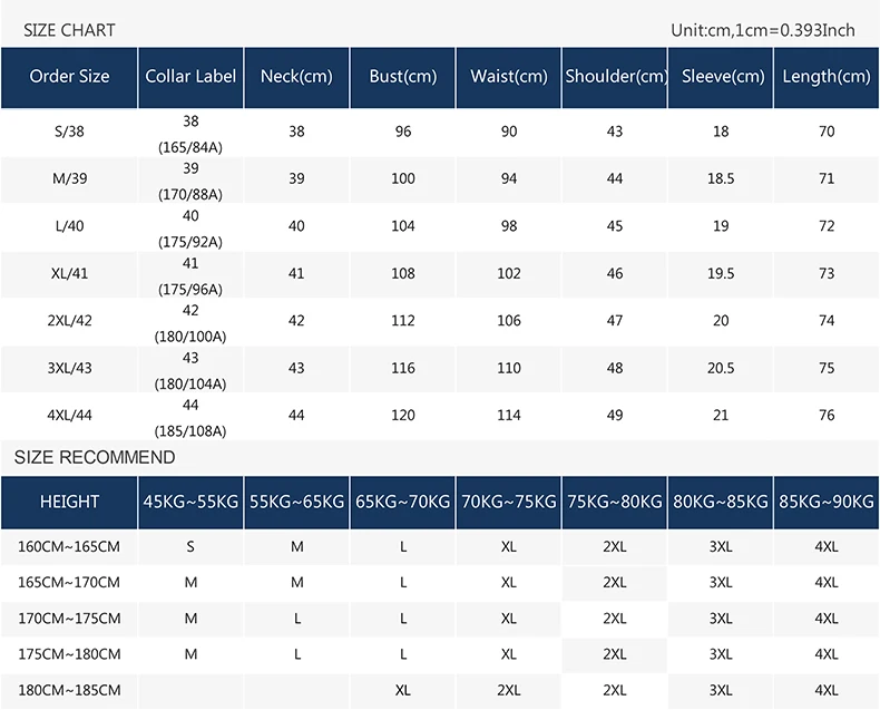 1. Наши размеры Азиатские, а не американские, а не европейские. 2. Поэтому, по сравнению с обычными рубашками, пожалуйста, внимательно проверьте таблицу размеров перед покупкой 3. Единицы измерения: 1 см = 0,394 дюйма, 1 дюйм = 2,54 см 4. Как правило, размер рубашки должен быть больше вашего размера. Вы можете проверить свою обычную рубашку. Если обхват груди 100 см, мы предлагаем вам выбрать рубашку с 104 см или 108 см. 5. Ручное измерение, погрешность 1-3 см