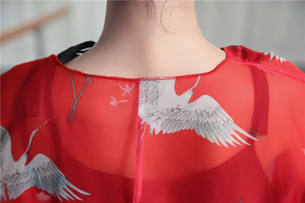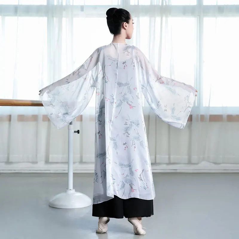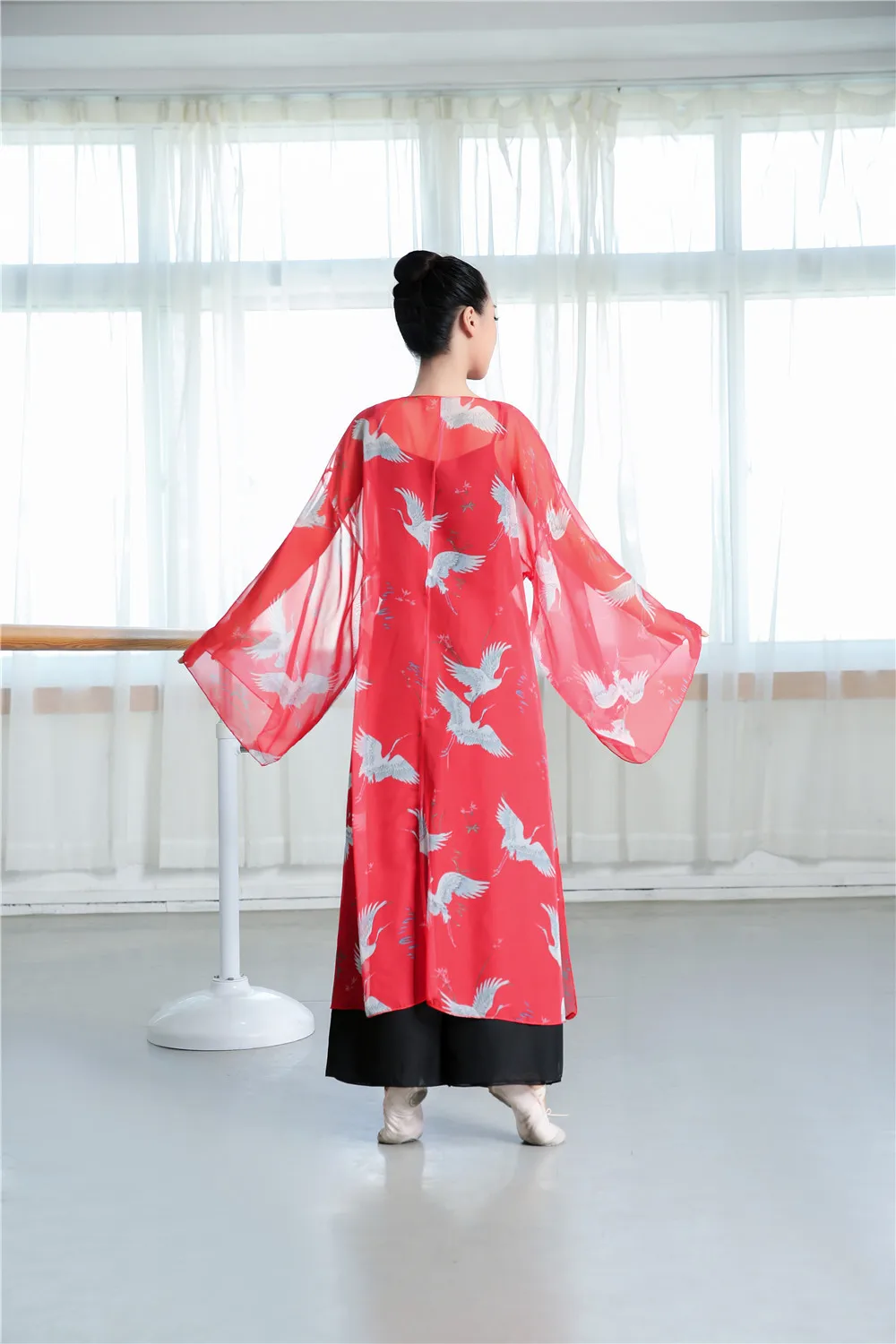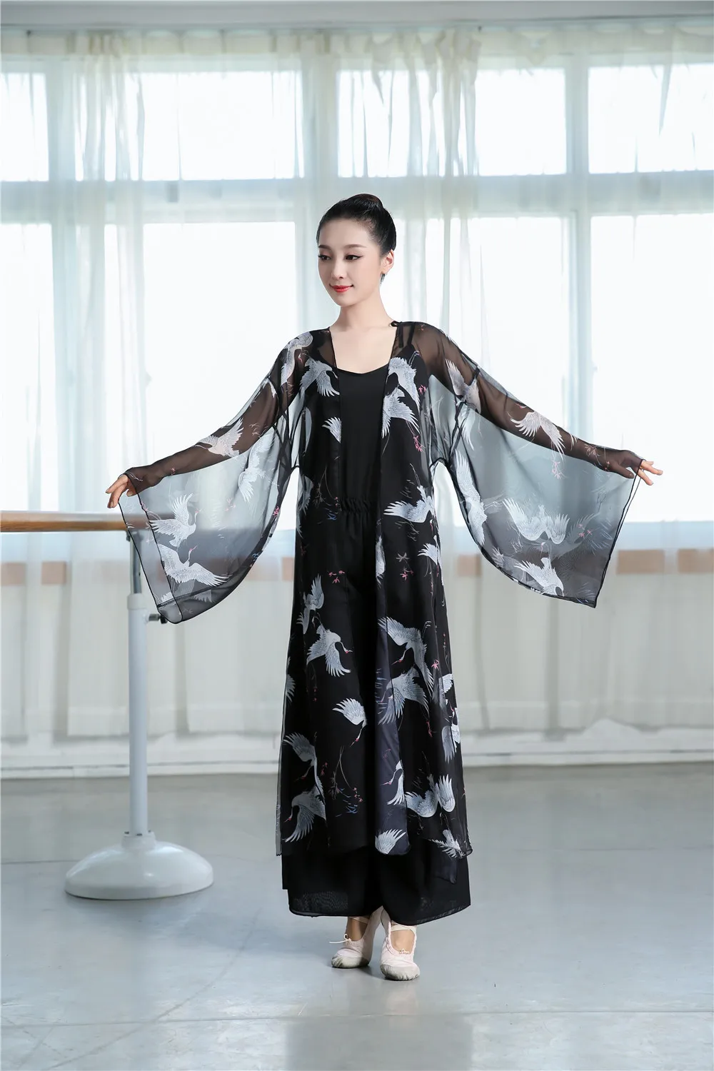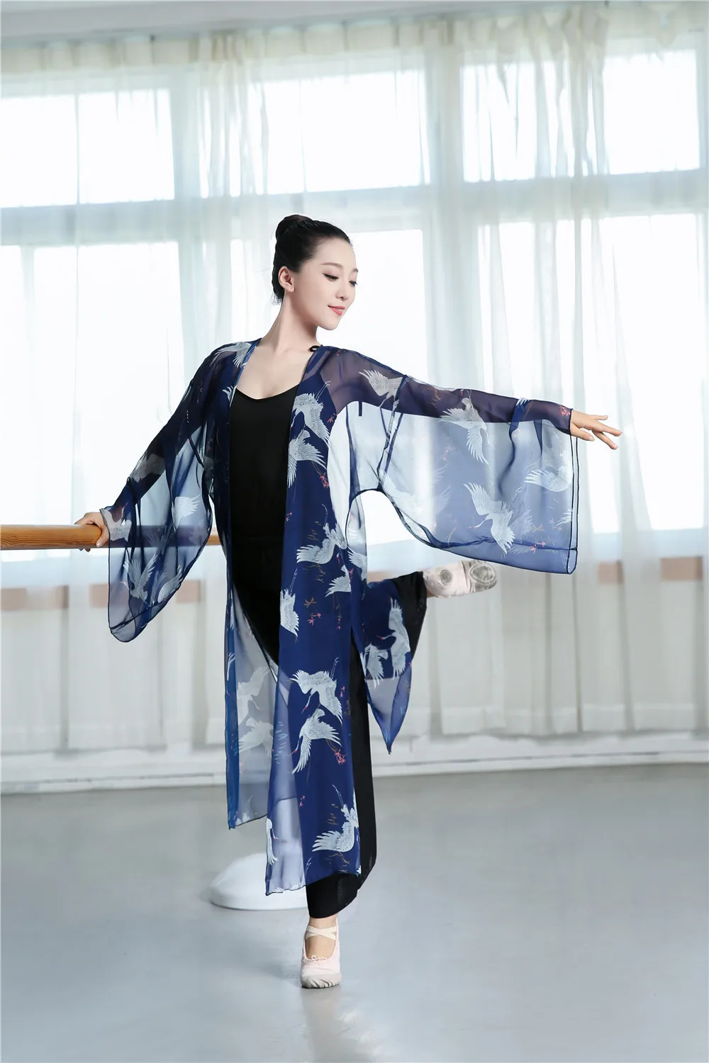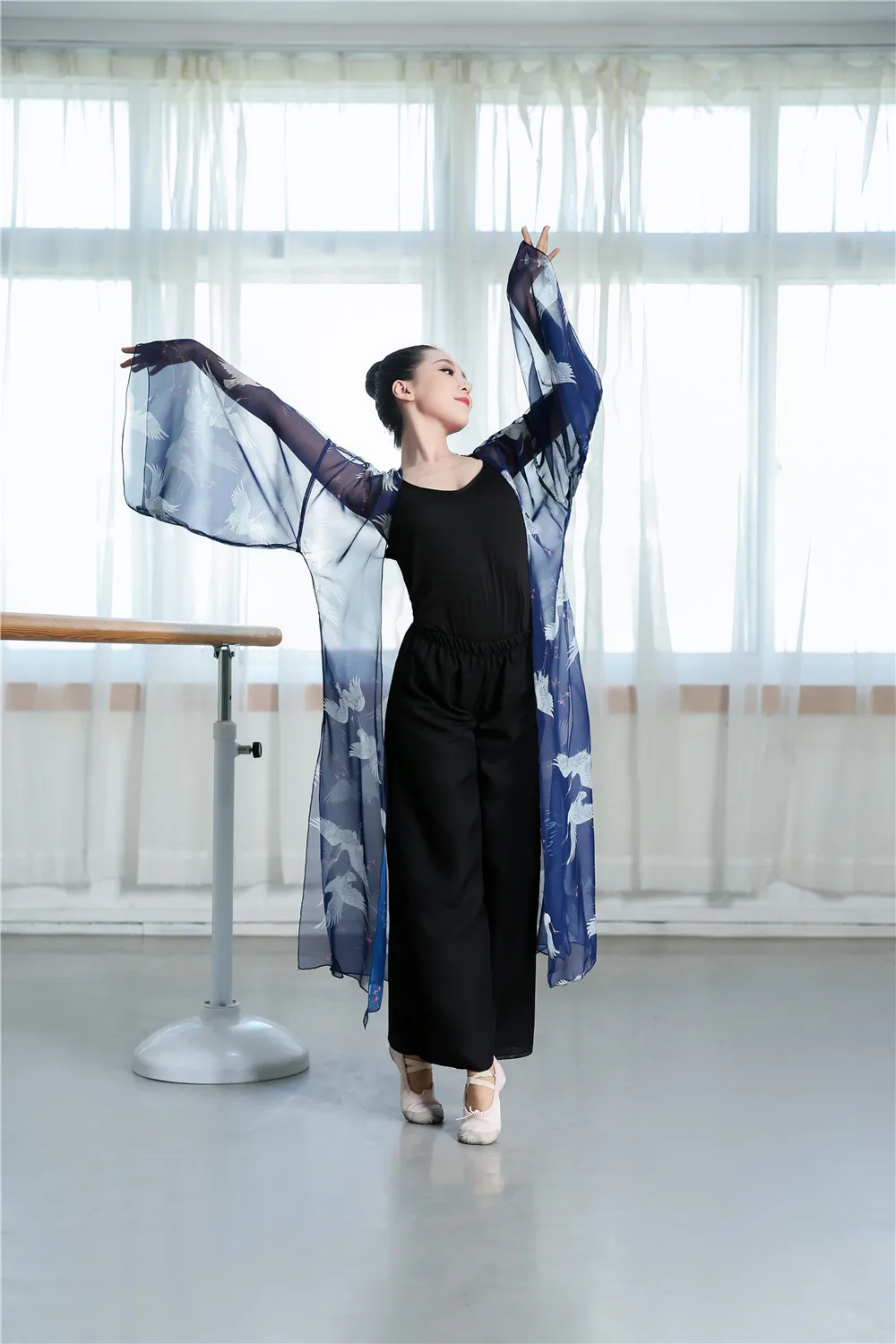 Современный женский костюм для танцев в китайском стиле; Шифоновый кардиган с национальным принтом журавлей; Элегантный бальный балет; Классическая Одежда для танцев