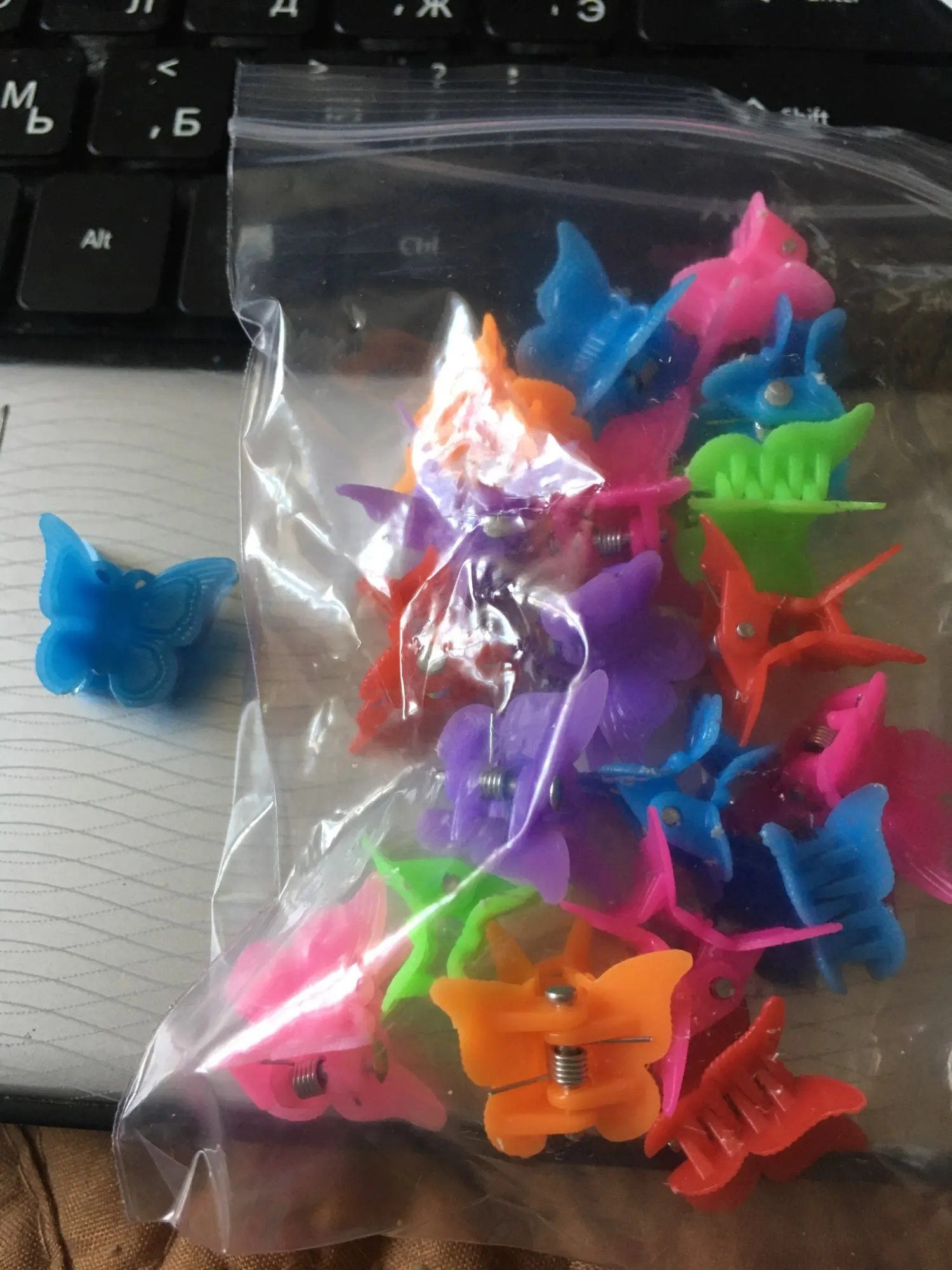 доставка достаточно быстрая, товар по стране отслеживался заколки пришли целые, но только у одной бабочки откололся краюшек крылошка, но это некритично