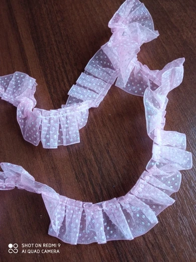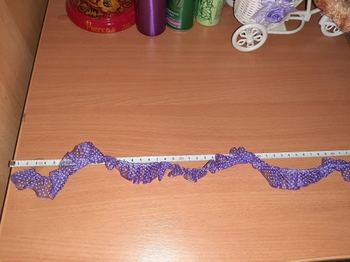 Неплохая капроновая лента,красивого фиолетового цвета в горошек. Пришла мятая и перекрученная,поэтому точно измерить не получилось,но то,что меньше заявленного метра - это точно!! Все ленты,которые я получила в последнее время такие,везде сплошной обман!! Доставка быстрая- меньше месяца до Подмосковья.