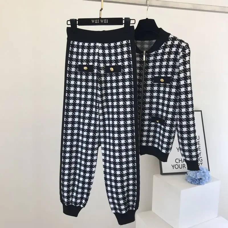 Модный большой клетчатый вязаный Топ, комплект из двух предметов, Ж...