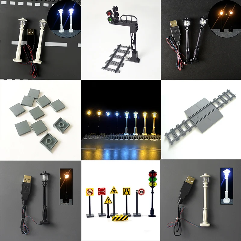 Городской уличный фонарь, светодиодные лампы, автомобильный пересечение сигнала, самодельные креативные строительные блоки, аксессуары, городской поезд, светофор для детей