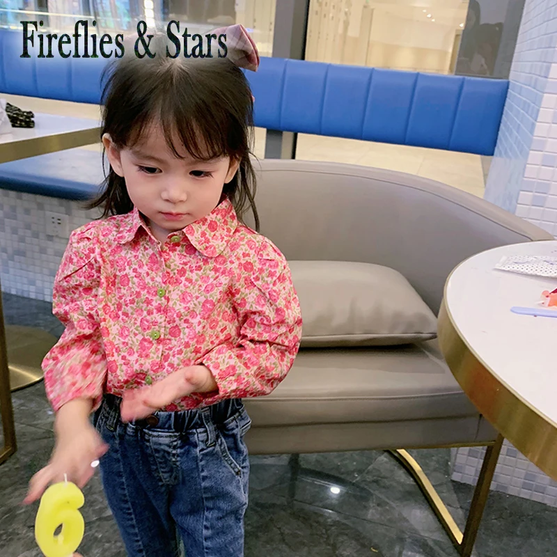 Демисезонная Блузка для девочек, рубашка для малышей, детские топы, модная одежда для детей, с цветами розы, с пышными рукавами и отложным воротником, от 2 до 8 лет