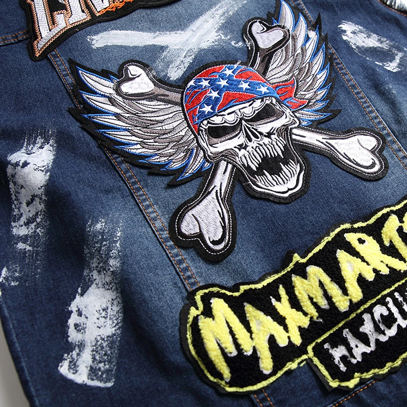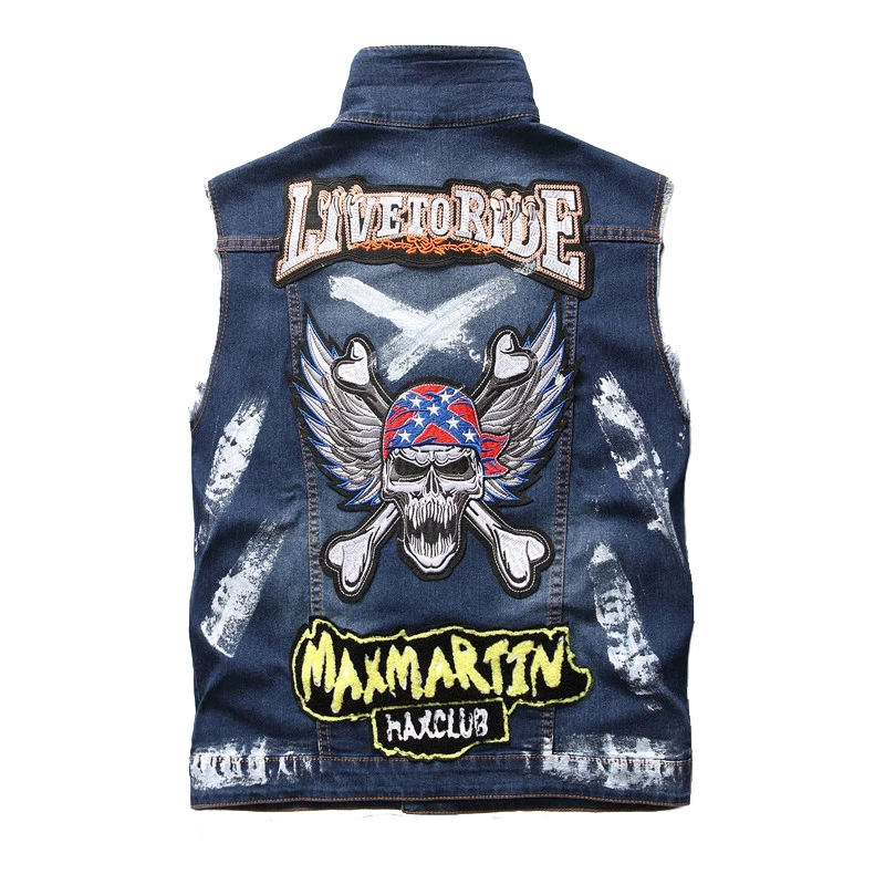 Мужской джинсовый костюм с вышивкой, ковбойский жилет с рисунком черепа + маленький прямой значок с флагом, тонкие джинсы, уличный стиль, комплект из 2 предметов