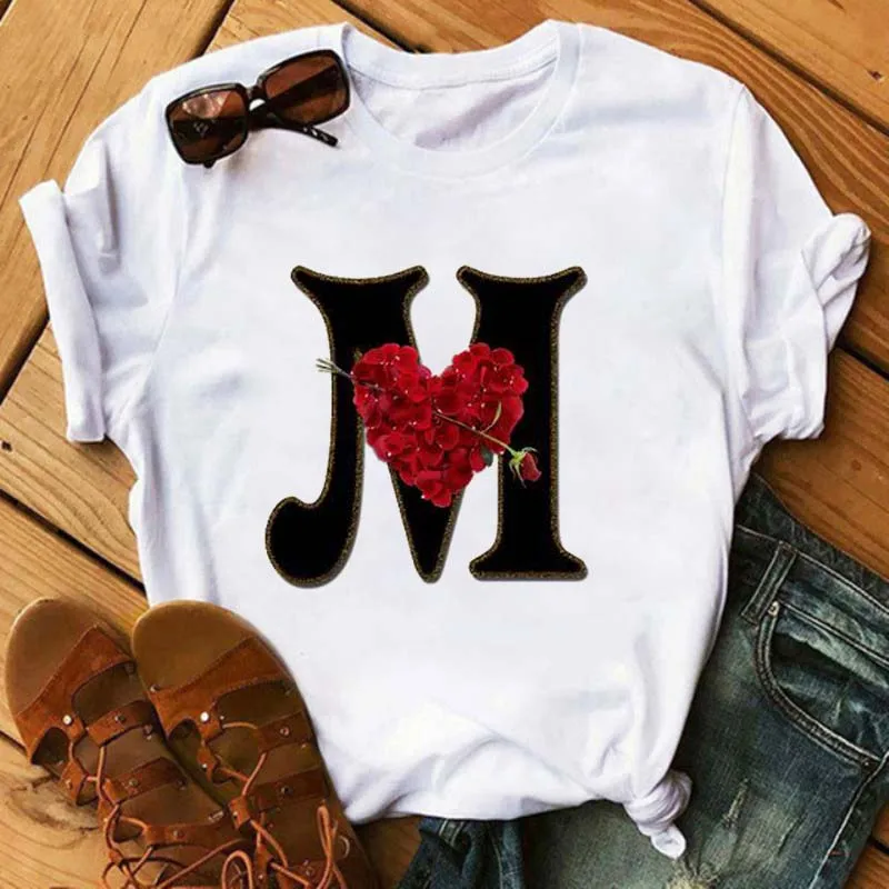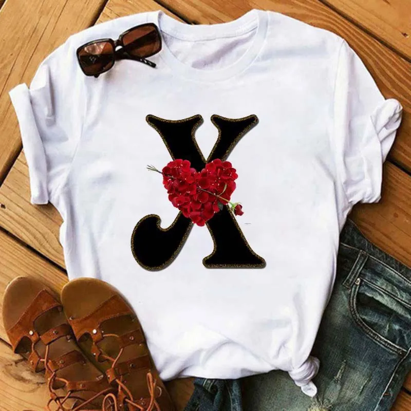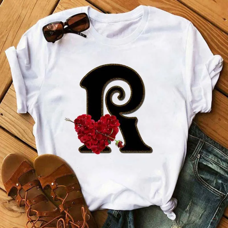 Комбинированная женская футболка с надписью имени на заказ, футболка с коротким рукавом с принтом в виде цветка розы, шрифта A, B, C, D, женские футболки, одежда
