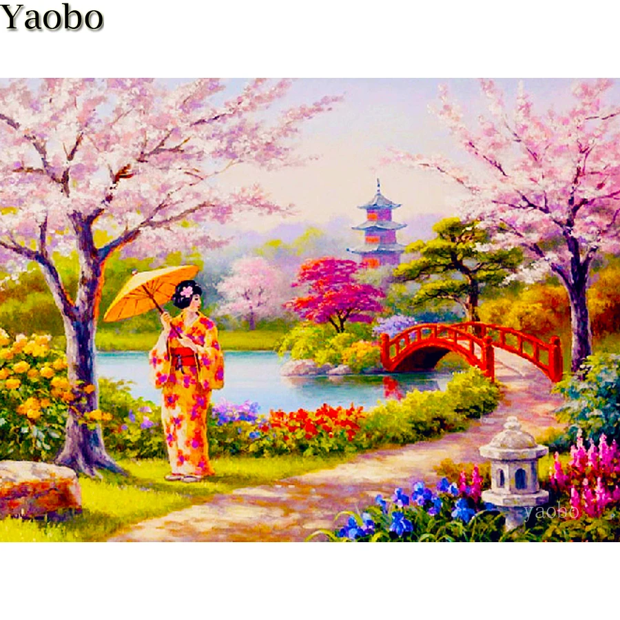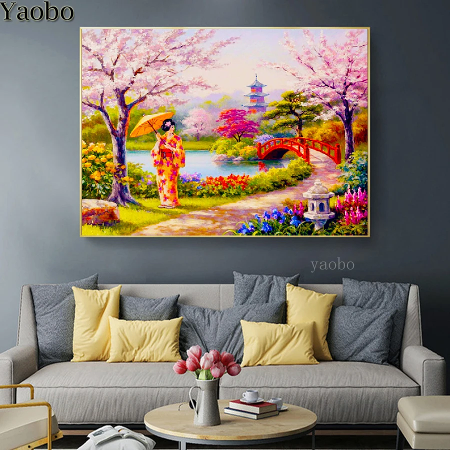 5D алмазная живопись, полная вышивка, квадратная, круглая Алмазная вышивка, Японская женщина, сад, весенний пейзаж, пазл, украшение для дома, подарок