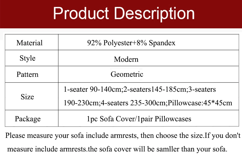 Материал: 92% полиэстер + 8% спандексУзор: геометрическийСтиль: РетроЦвет: как на изображенииРазмер:Чехол на одно сиденье: подходит для диванов 90-140 смДвухместная крышка дивана: подходит для дивана 145-185 смЧехол для дивана с тремя сиденьями: подходит для 190-230 смЧехол для дивана на четыре сиденья: подходит для 235-300 смПрименимый диван: безрукий диван, диван с подлокотниками, l-образный диван,Mide секционный диван с подлокотниками и выберите размер. Если вы не измерите его, чехол для дивана будет меньше, чем ваш диван.Посылка включает в себя: 1 диван