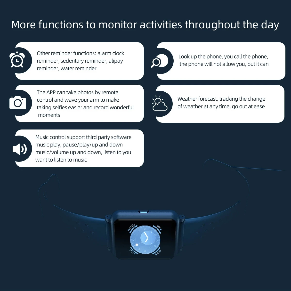 1. Разработан с 1,3-дюймовым ярким цветным сенсорным экраном, который обеспечивает невероятную глубину цвета и исключительную четкость.2. Встроенный аккумулятор 170 мАч, длительное время ожидания и время работы.3. Изменение пульса, захват в реальном времени; Оптический датчик пульса, мониторинг пульса во время тренировок в реальном времени, защита вашего здоровья сердца.4. Основные функции: шаги, пульс, артериальное давление, насыщенность крови кислородом, запись данных упражнений, выбор циферблата, push-сообщение, ежедневный будильник, фотоконтроль, информация о погоде и т. д.5. Легкий и удобный.