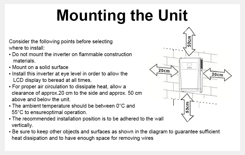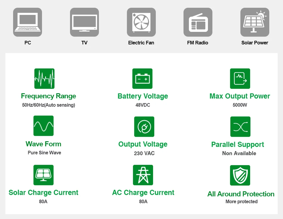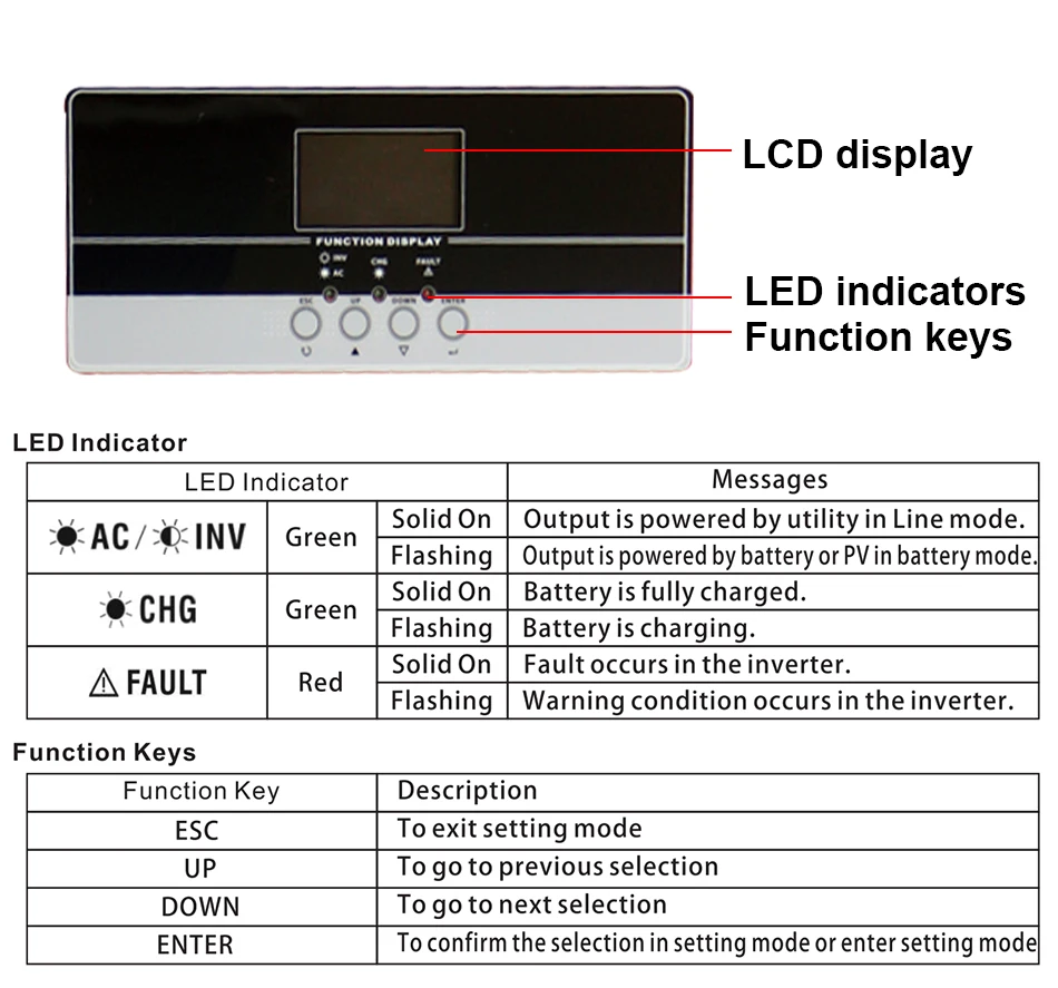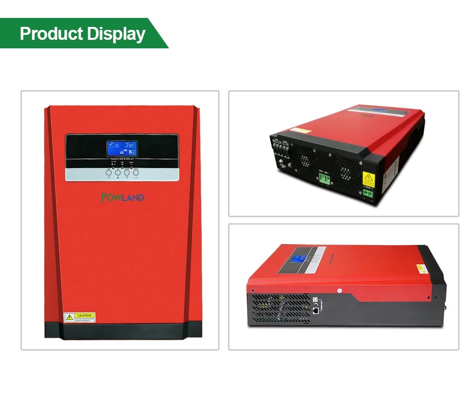 Это многофункциональный инвертор/зарядное устройство, сочетающее в себе функции инвертора, солнечного зарядного устройства и зарядного устройства для обеспечения поддержки бесперебойного питания с портативным размером. Его комплексный ЖК-дисплей обеспечивает настраиваемую пользователем и легкодоступную работу кнопок, таких как зарядный ток аккумулятора, приоритет зарядного устройства переменного/солнечного тока и приемлемое входное напряжение в зависимости от различных применений