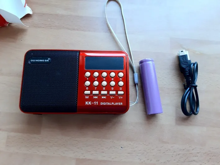 Получил приёмник через неделю после заказа (Новосибирск, заказывал из России). Внешний вид не такой, как на фотографии (см. фото). Нет надписи ёмкости на аккумуляторе, проверил, вес аккумулятора 36 грамм, зарядное устройство показало 1220 мА*ч, На удивление аккумулятор соответствует заявленным характеристикам. Как уже писали очень громкий, включается всегда с одной и той же громкостью, установленной на заводе. Если нужно послушать радио в тишине - проблема, начинает громко воспроизводить, пока громкость выкрутишь на min - люди рядом просыпаются. Звук чистый, приятно слушать (не меломан). Громкость min = 1, всё равно очень громко. Опять же не послушаешь радио, если недалеко спят. Зато можно зимой можно засунуть радио под куртку и идти на морозе, и всё будет слышно через куртку всем :). Качество сборки хорошее. Станции ловит в среднем немного лучше, чем похожие китайские приёмники (у меня их штук 5). Товаром доволен. Рекомендую товар и продавца.