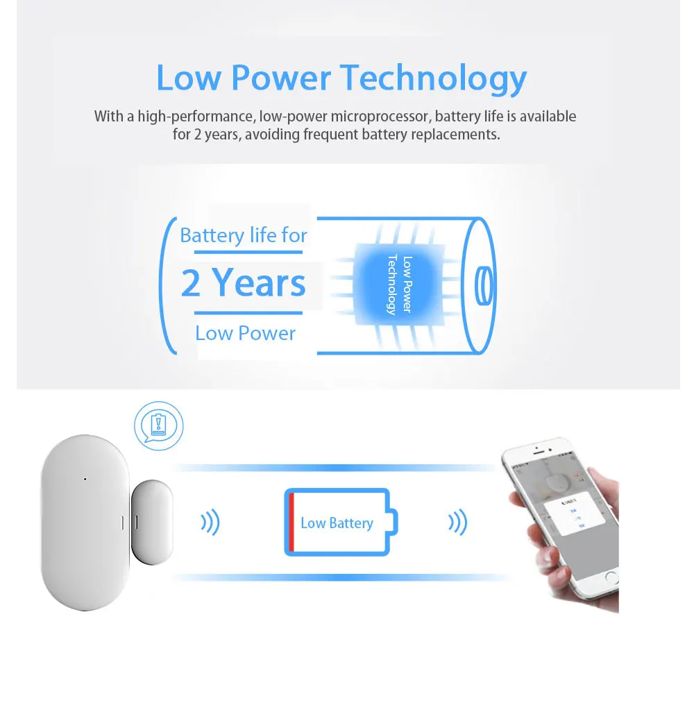 Супер Низкое энергопотребление, оповещение о низком заряде батареи. Время работы от аккумулятора: 1 год (25 раз/день); 3 года (10 раз/день). Нормальный WIFI датчик для двери батареи может работать только около 6 месяцев.
