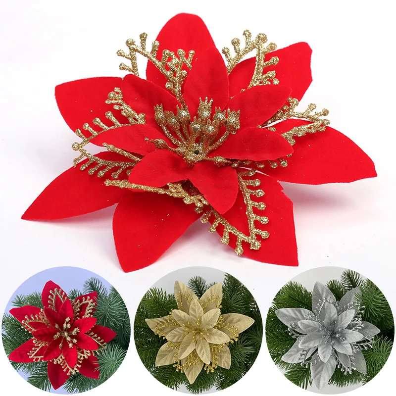 5 шт. Искусственные Рождественские цветы, блестящие пуансетции для ...